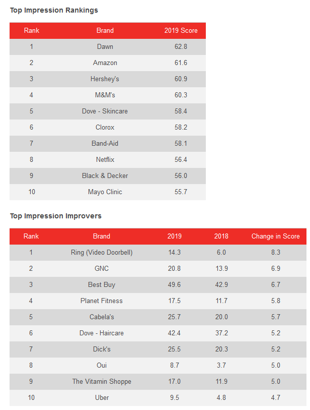 跻身前五名的还有Dove Skincare(58.4),这是今年进入前十榜单的新品牌。