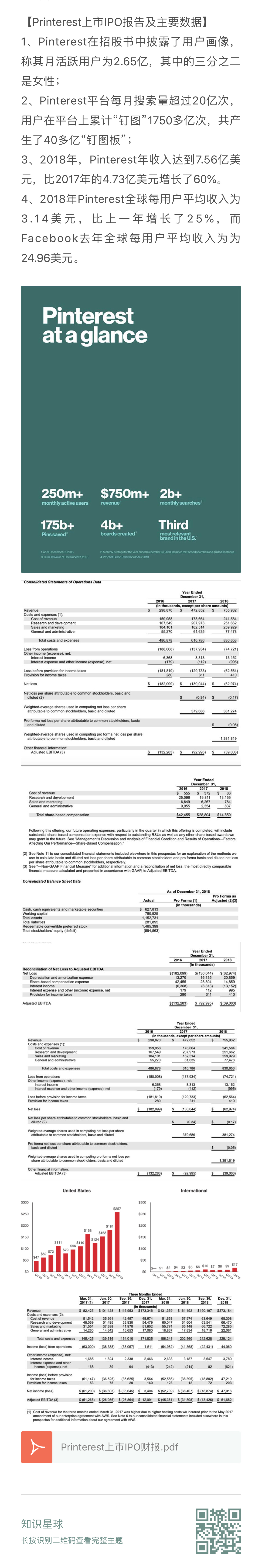 1、Pinterest在招股书中披露了用户画像,称其月活跃用户为2.65亿,其中的三分之二是女性;