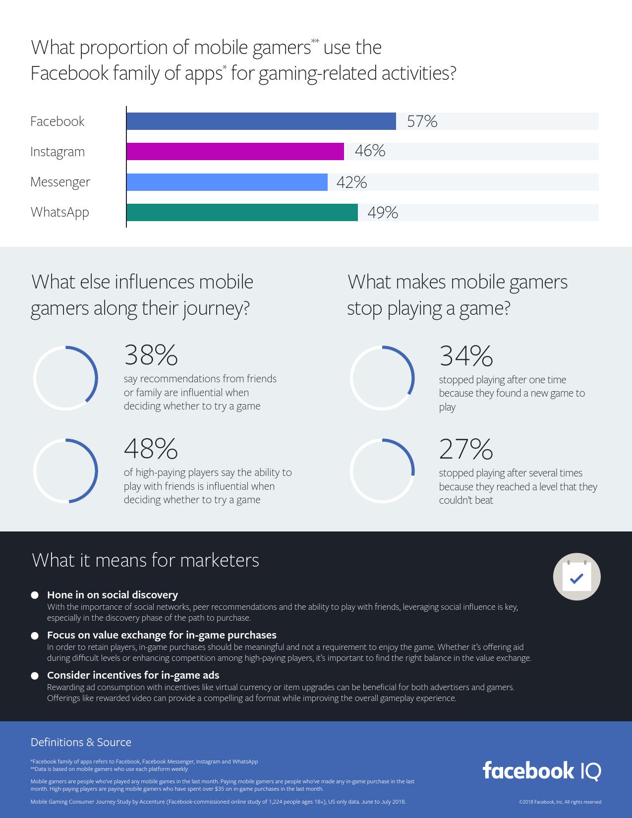 在我们研究社交平台对人们试玩游戏的决定产生的影响时,日本 44% 的即时战略游戏玩家、38% 的博彩游戏玩家和 37% 的实时竞技游戏玩家表示 Facebook 旗下应用发挥了作用。这些应用可能通过广告、小组和主页,或好友的帖子和消息产生影响。