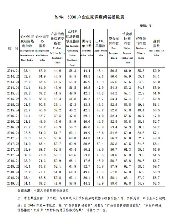 2019 年第一季度中国人民银行企业家问卷调查结果显示: