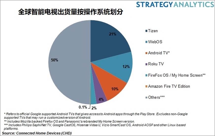 Strategy Analytics最新发布的研究报告指出,2018年智能电视的全球销量达到1.57亿台,占全年电视总销量的67%。 目前销售的每五台智能电视中,超过五分之一的智能电视都在使用三星开发的Tizen平台,十分之一运行在谷歌管理的安卓电视系统上。2018年Roku TV占全球电视销售额的4%,但其销售主战场仍在北美——去年每四台智能电视中就有近四分之一的电视由Roku提供支持。许多中国电视制造商都在使用定制版本的安卓操作系统(AOSP),这些产品不能与谷歌应用商店结合使用,只用于其国内智能电视产品,并占非专有智能电视操作系统的很大一部分。