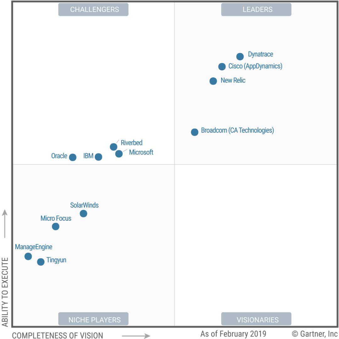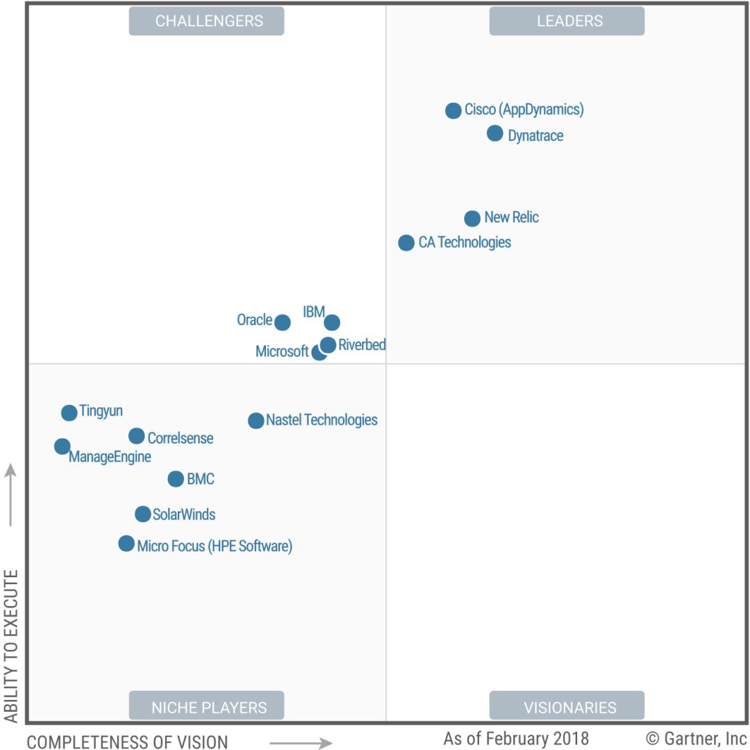 Gartner的魔力象限分为四类:领导者、挑战者、有远见者和特定领域者。每家供应商都根据优势、劣势、市场份额、用户评论以及其他度量指标列入到相应的象限上。Gartner为该魔力象限分析的12家供应商是:博通(冠群科技)、思科(AppDynamics)、Dynatrace、IBM、ManageEngine、Micro Focus、微软、New Relic、Oracle、Riverbed、SolarWinds和听云。