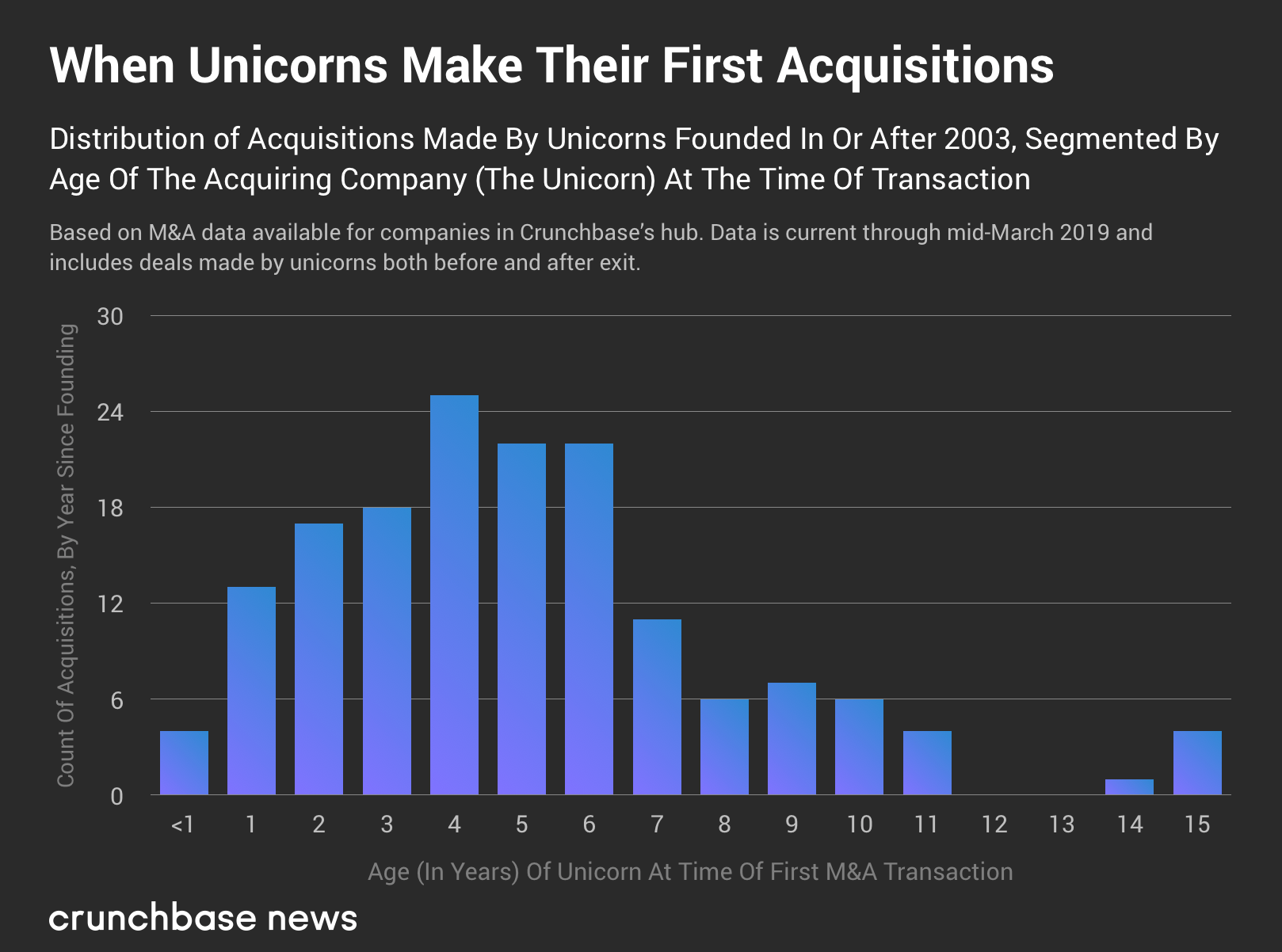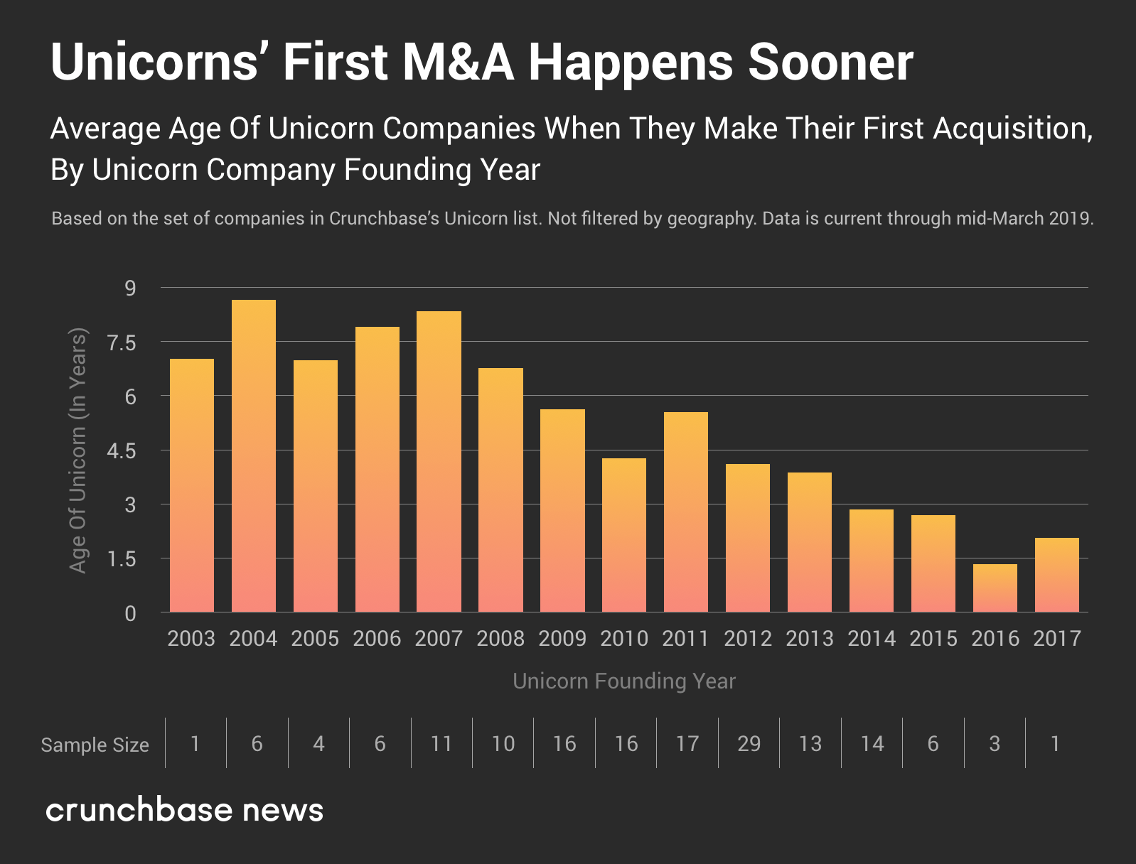 Crunchbase的数据表明,新晋独角兽能以更快的速度完成第一笔并购交易。换句话说,年轻的独角兽会更早地收购其他公司。