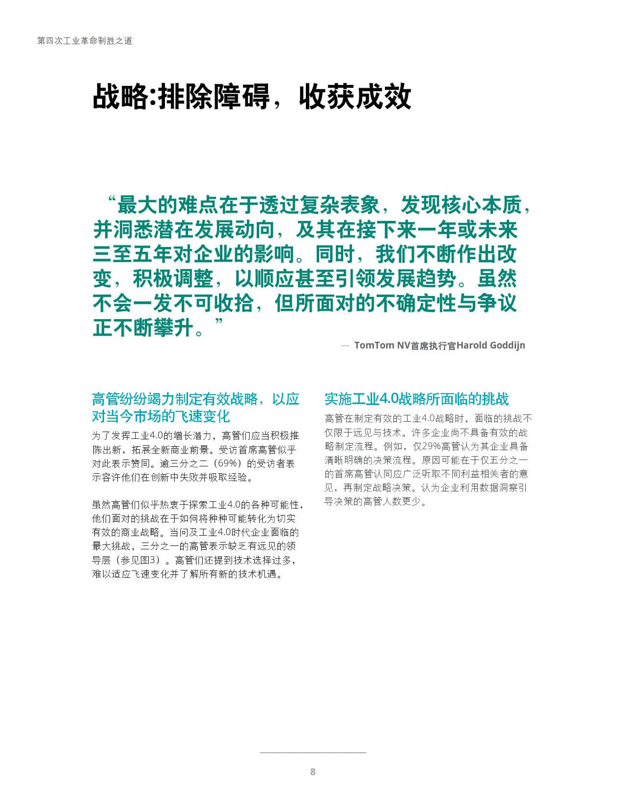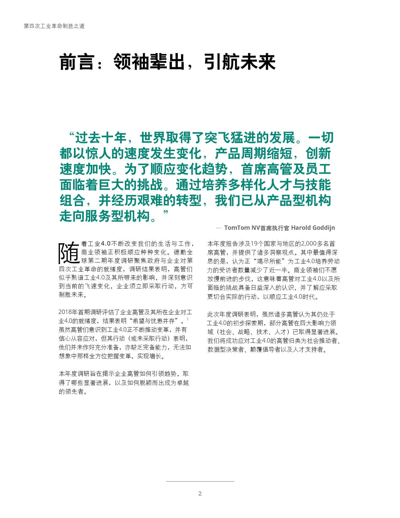 《第四次工业革命制胜之道-风云变幻下的四种领导角色》是德勤第二期年度调研聚焦政府与企业对第四次工业革命的就绪度,采访了来自全球19个国家与地区的2000多名首席高管,旨在揭示企业高管如何引领趋势,取得了哪些显著进展,以及如何脱颖而出成为卓越的领先者。