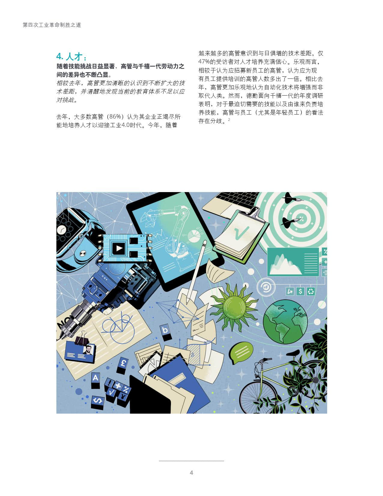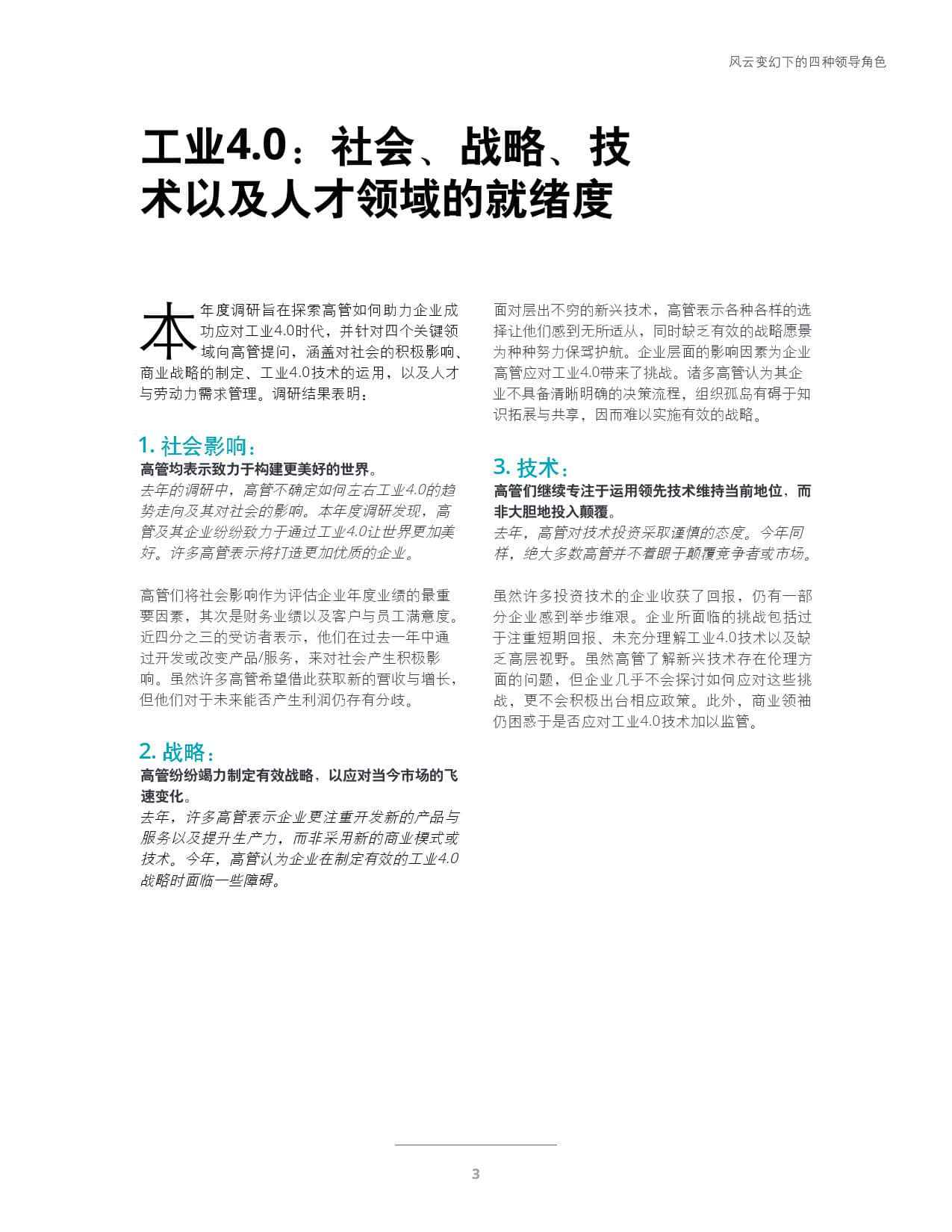 本次年度调研旨在探索高管如何助力企业成功应对工业4.0时代,并将在四个关键领域(社会、战略、技术、人才)取得显著进展的高管归类为社会推动者、数据型决策者、颠覆倡导者以及人才支持者。文中分别从这四大领域阐述工业4.0的就绪度,涵盖对社会的积极影响、商业战略的制定、工业4.0技术的运用,以及人才与劳动力需求管理。