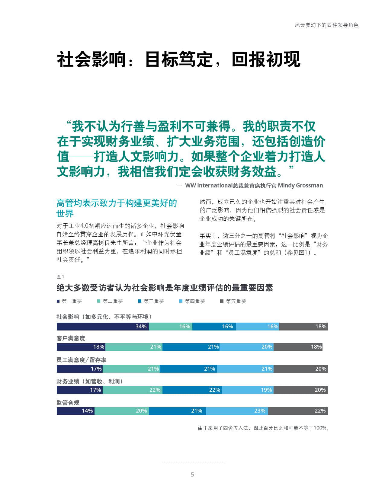 社会影响:高管均表示致力于构建更美好的世界。高管们将社会影响作为评估企业年度业绩的最重要因素,其次是财务业绩以及客户与员工满意度。近四分之三的受访者表示,他们在过去一年中通过开发或改变产品/服务,来对社会产生积极影响。虽然许多高管希望借此获取新的营收与增长,但他们对于未来能否产生利润仍存有分歧。