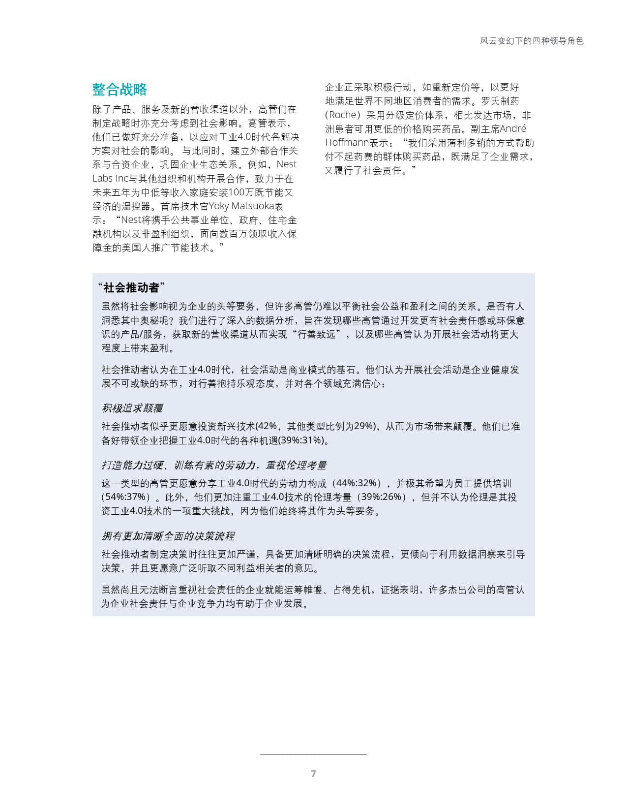致力于创造更美好的社会:领先者们积极地借助工业4.0创造更美好的社会,并以合乎伦理的方式利用新技术。许多企业因关注社会问题而开发的产品和服务已经成为其新的业务收入来源。