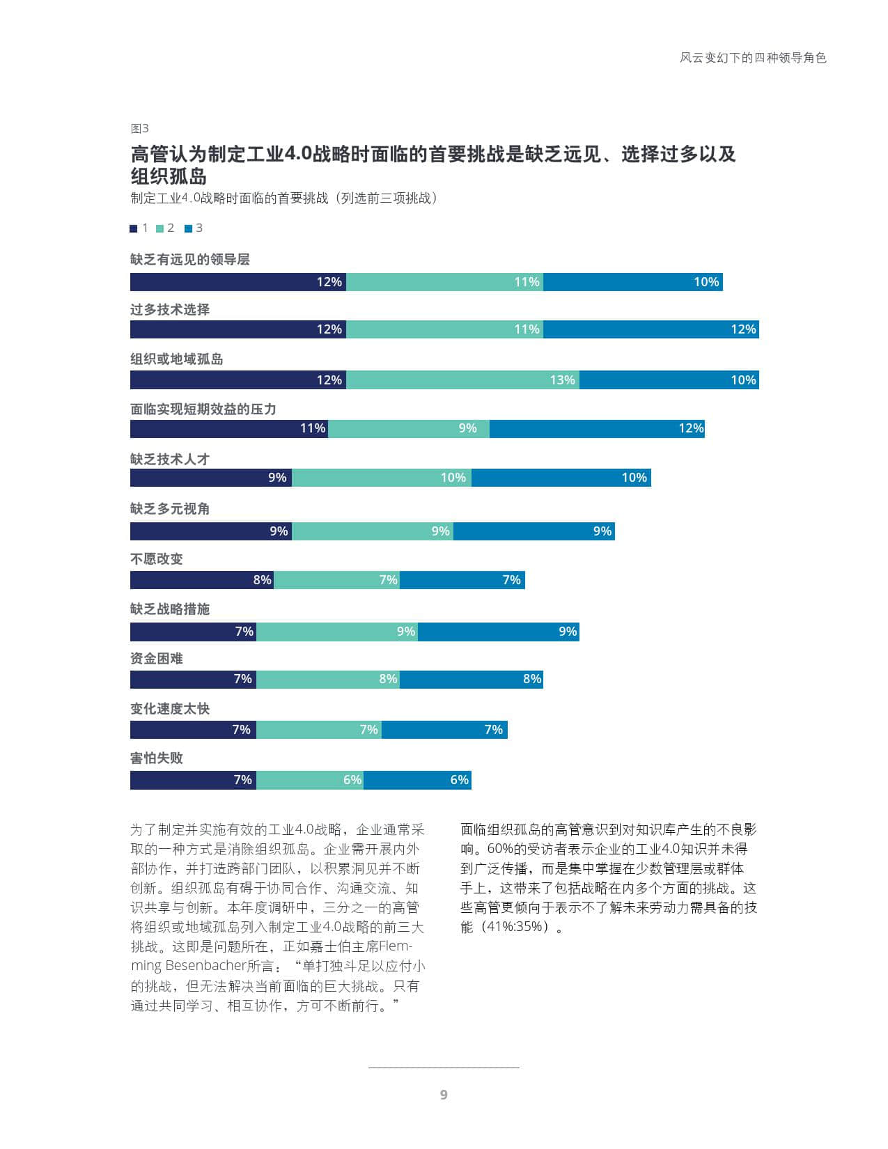 战略:高管纷纷竭力制定有效战略,以应对当今市场的飞速变化。面对层出不穷的新兴技术,高管表示各种各样的选择让他们感到无所适从,同时缺乏有效的战略愿景为种种努力保驾护航。企业层面的影响因素为企业高管应对工业4.0带来了挑战。诸多高管认为其企业不具备清晰明确的决策流程,组织孤岛有碍于知识拓展与共享,因而难以实施有效的战略。