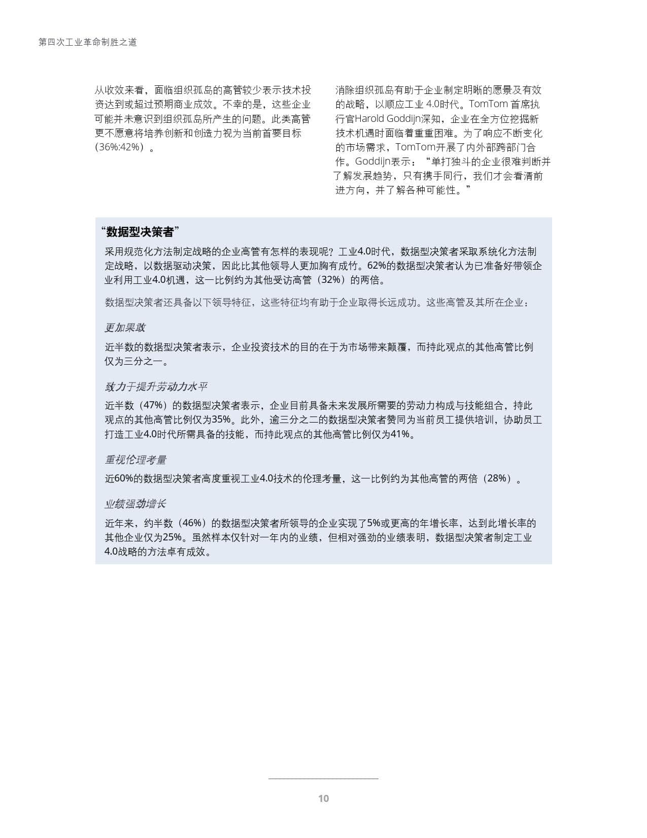 对于未来有更清晰的远见:领先者们在制定工业4.0战略时既重视目的,也重视方法。相较于其他企业,他们所在的公司更善于遵循清晰明确的流程,并利用数据驱动决策。