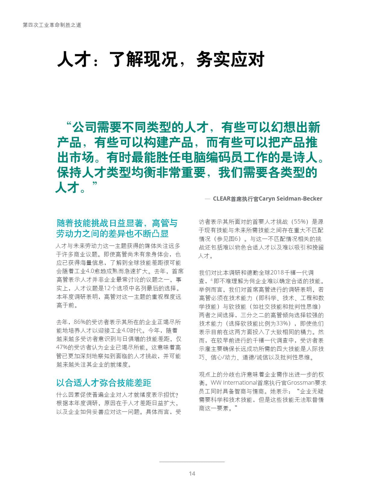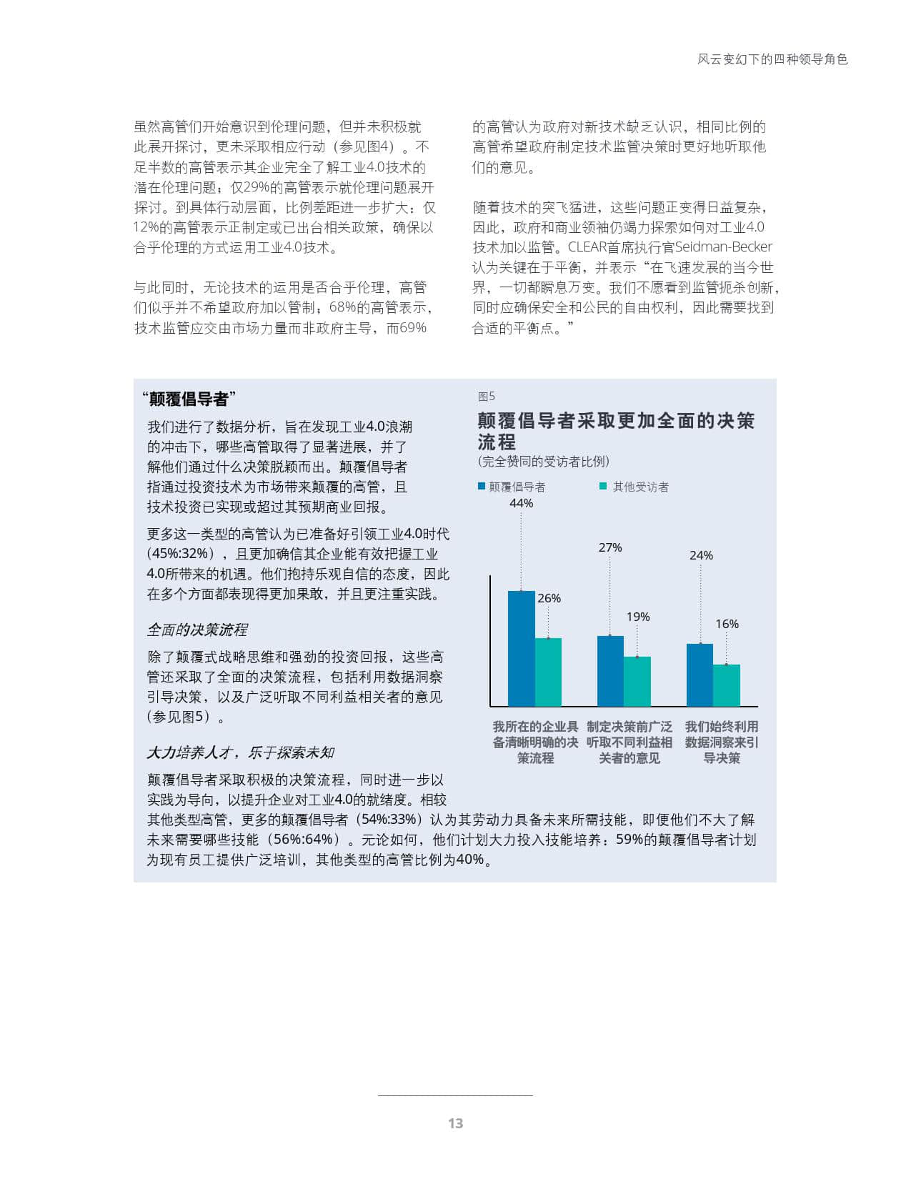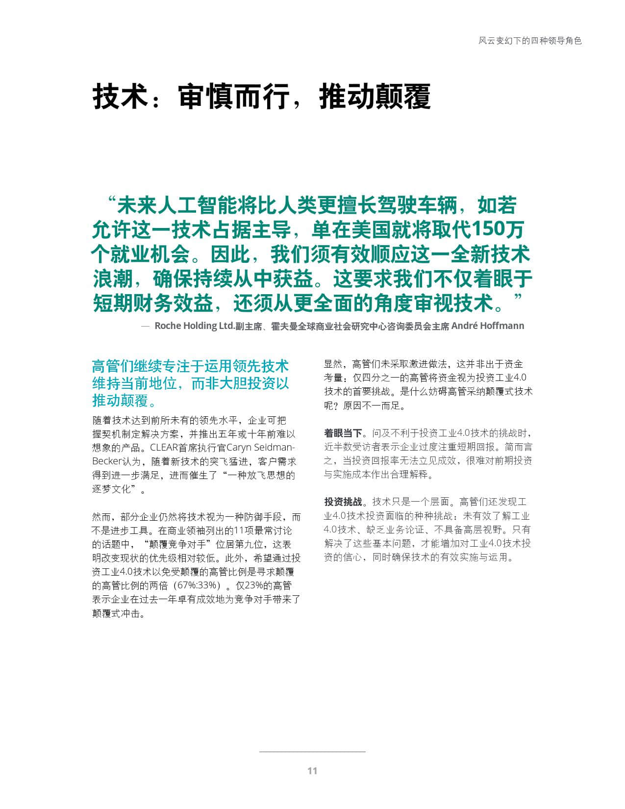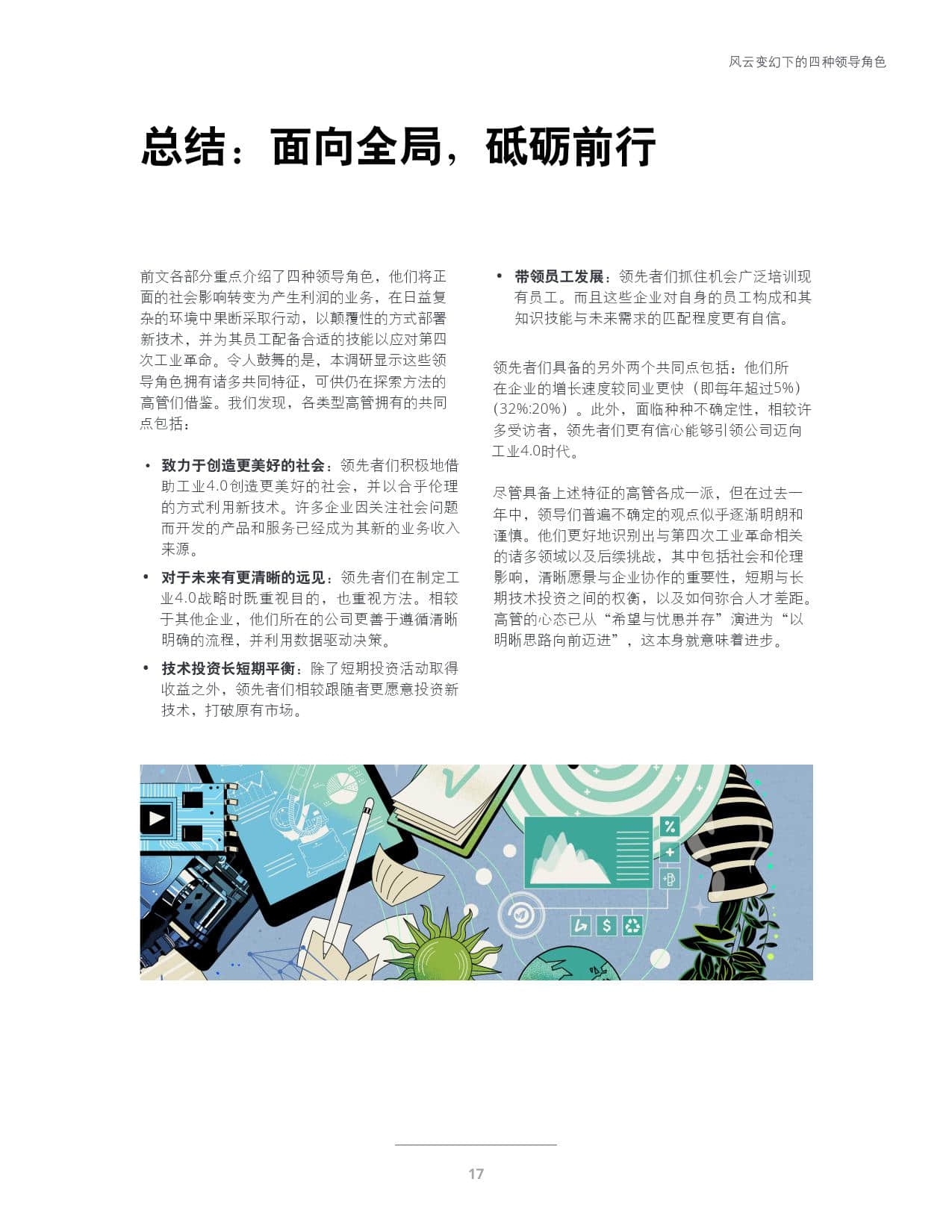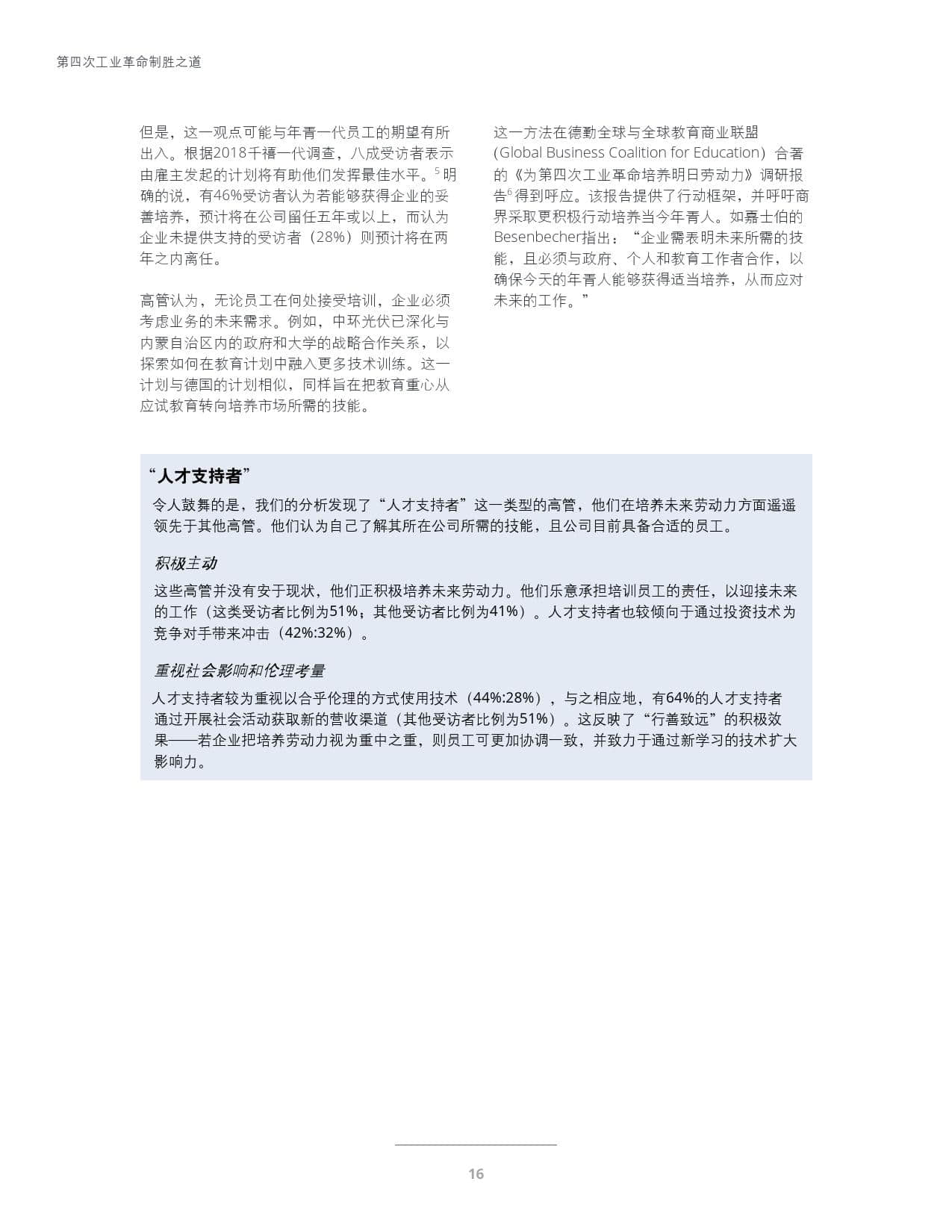 尽管具备上述特征的高管各成一派,但在过去一年中,领导们普遍不确定的观点似乎逐渐明朗和谨慎。他们更好地识别出与第四次工业革命相关的诸多领域以及后续挑战,高管的心态已从“希望与忧患并存”演进为“以明晰思路向前迈进”,这本身就意味着进步。