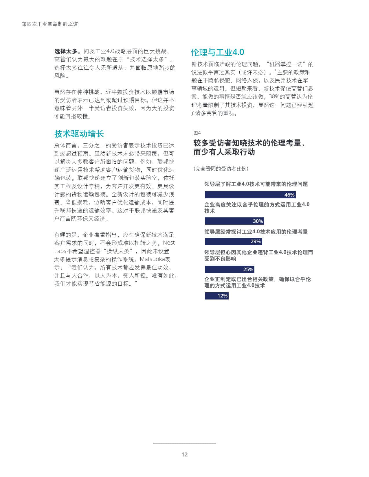 技术:高管们继续专注于运用领先技术维持当前地位,而非大胆地投入以驱动颠覆。虽然许多投资技术的企业收获了回报,仍有一部分企业感到举步维艰。企业所面临的挑战包括过于注重短期回报、未充分理解工业4.0技术以及缺乏高层视野。虽然高管了解新兴技术存在伦理方面的问题,但企业几乎不会探讨如何应对这些挑战,更不会积极出台相应政策。此外,商业领袖仍困惑于是否应对工业4.0技术加以监管。