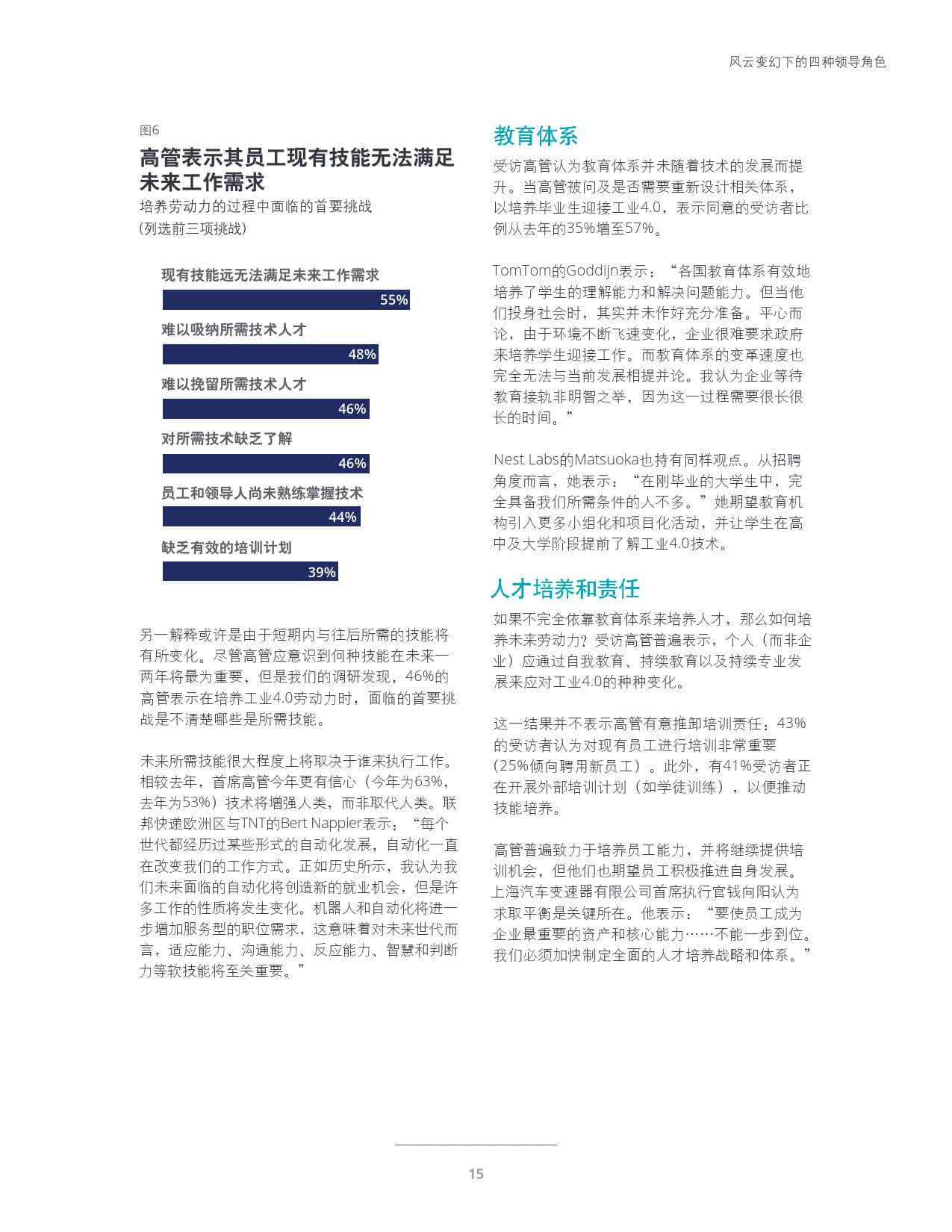 人才:随着技能挑战日益显著,高管与千禧一代劳动力之间的差异也不断凸显。相较去年,高管更加清晰的认识到不断扩大的技术差距,并清醒地发现当前的教育体系不足以应对挑战。乐观而言,相较于认为应招募新员工的高管,认为应为现有员工提供培训的高管人数多出了一倍。相比去年,高管更加乐观地认为自动化技术将增强而非取代人类。然而,德勤面向千禧一代的年度调研表明,对于最迫切需要的技能以及由谁来负责培养技能,高管与员工(尤其是年轻员工)的看法存在分歧。