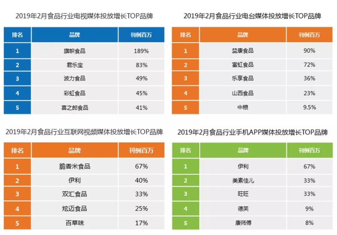 从投放品牌进行分析,以旗帜奶粉为产品的旗帜食品和君乐宝在电视媒体有大幅增长,更看重传统媒体的公信力;以益康糕点汤圆为产品的益康品牌增加了在电台的投放量,伊利在互联网视频、手机APP加大投放,用更广泛的宣传量拥抱年轻人,打通年轻化战略。