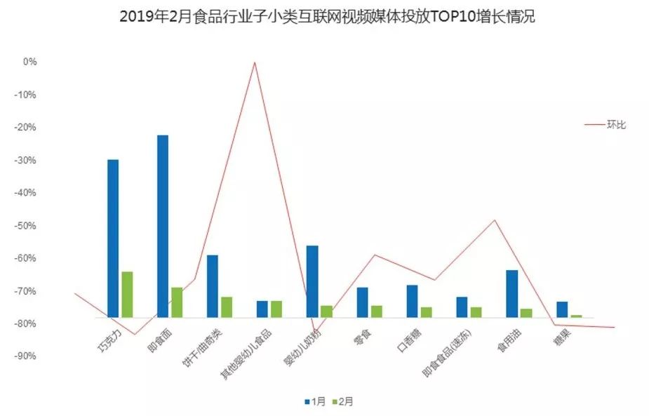 从互联网的广度与精度上,巧克力、即食面在互联网视频媒体投放位居前两名,饼干/曲奇类产品较1月相比跻身第三名的位置,婴幼儿食品投放力度依旧保持稳定,糖果和零食类产品占据排行榜多数位置,也对应了互联网视频年轻化受众的特质。