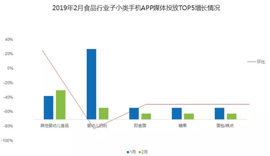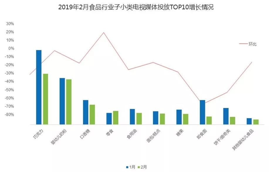 在食品行业子小类的细分中,食品类电视媒体投放前三名的子小类依次为巧克力、婴幼儿奶粉及口香糖,其中,巧克力类产品的投放较1月有32%降幅,零食品类在2月有小幅上涨达19%。可见,春节等节日的消费氛围对食品类的消费增长影响显著