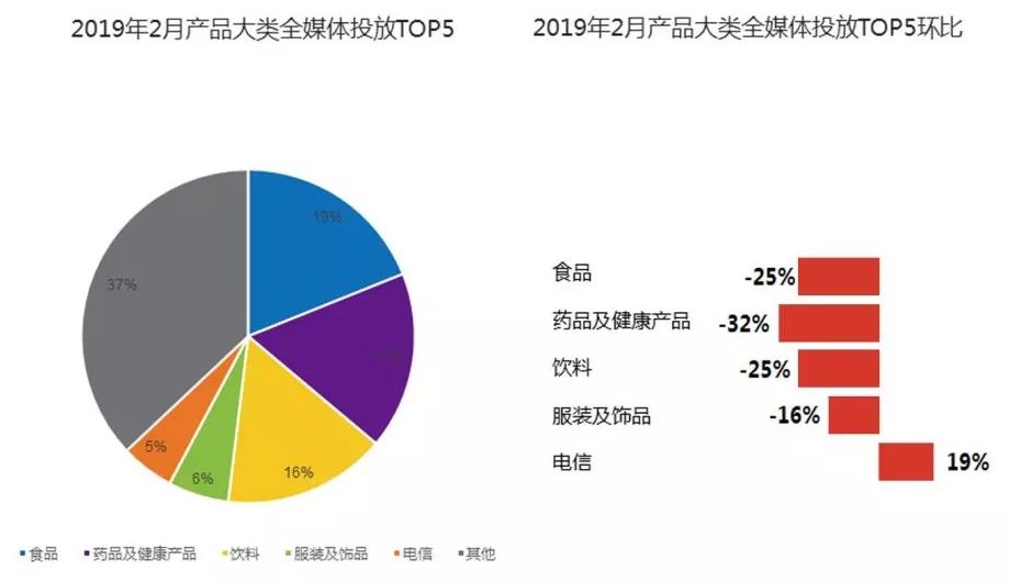 数据显示,本月全媒体投放产品大类前TOP5如下:其中食品类占据本月TOP1的位置,药品及健康产品类和饮料类分别位居第二和第三,服装及饰品类别位列第四,而电信类虽位居第五,较1月有19%涨幅。从本月的前TOP3中不难看出,市场的关注点更聚焦于民生,即食品、药品及健康产品类别,从而可以看出民众的消费水平与购买能力、偏好的发展方向。