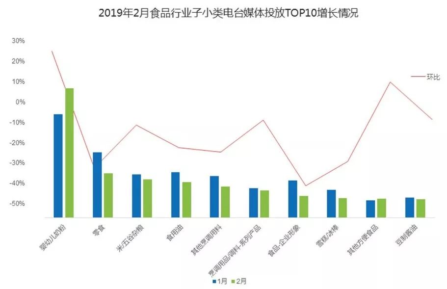 电台媒体作为一种传统媒介手段,对于消费者的触媒习惯也更具有适用性。从电台媒体投放分析,食品行业子小类婴幼儿奶粉产品暂居第一,增幅率较1月提升25%。借助电台媒体的传播特性与稳定的触媒人群属性,为产品进行具有针对性的有效宣传,婴幼儿奶粉产品针对私家车主的妈咪群体,通过电台形成大范围、高覆盖的受众圈层,在市场媒介投放上的划分与运用上可见一斑。