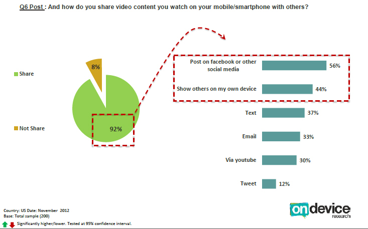 56%的人会选择通过Facebook等社交网络进行分享,44%的人在手机上直接秀给别人看,短信和电子邮件分别为37%和33%