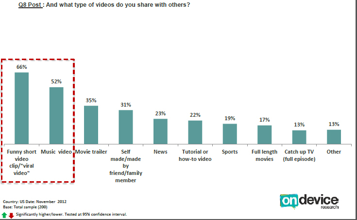 Ondevice针对美国手机视频用户进行了日志法调研,发现短小精悍的内容很受用户喜爱,而有趣的内容最能激发用户分享。