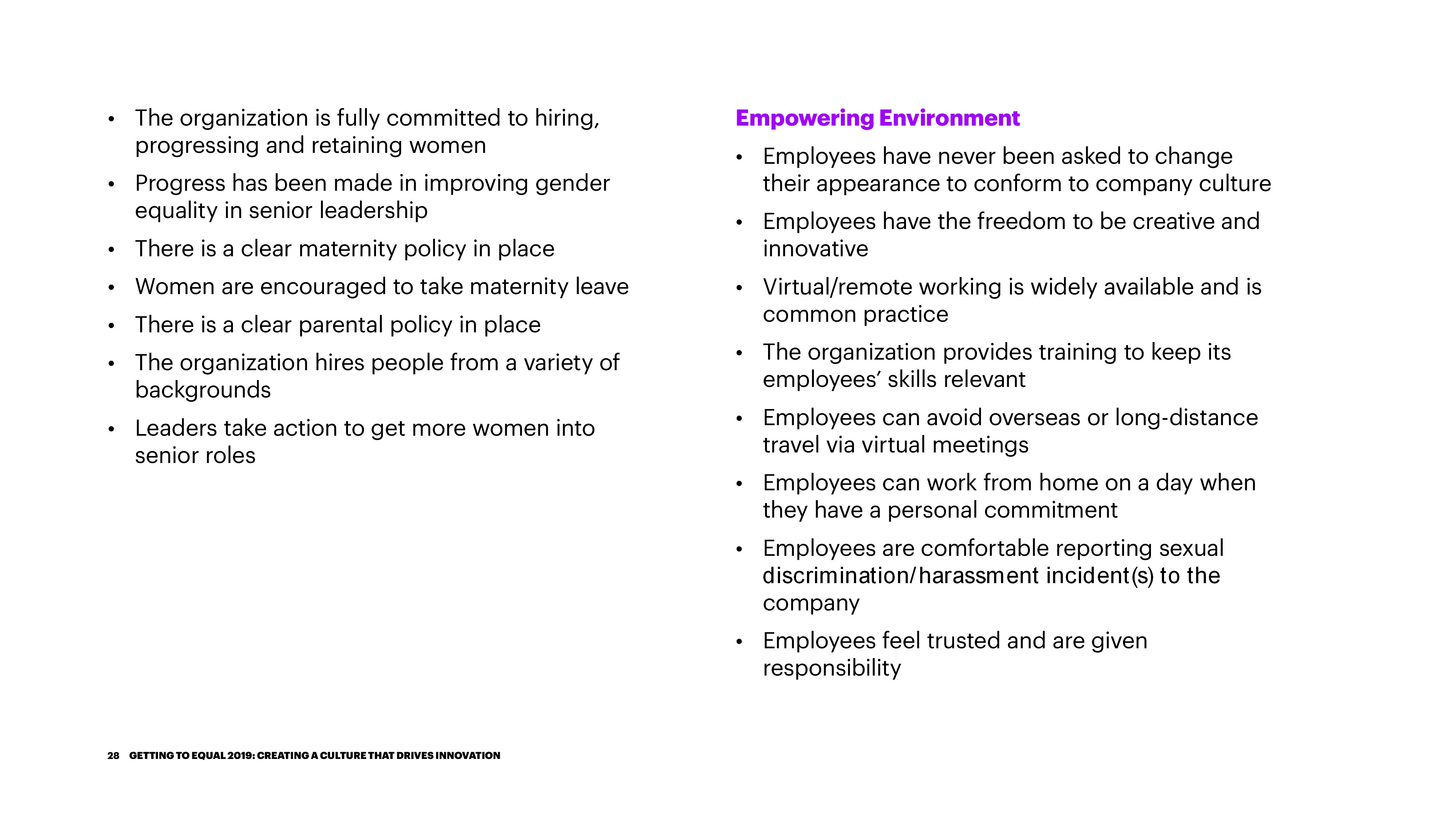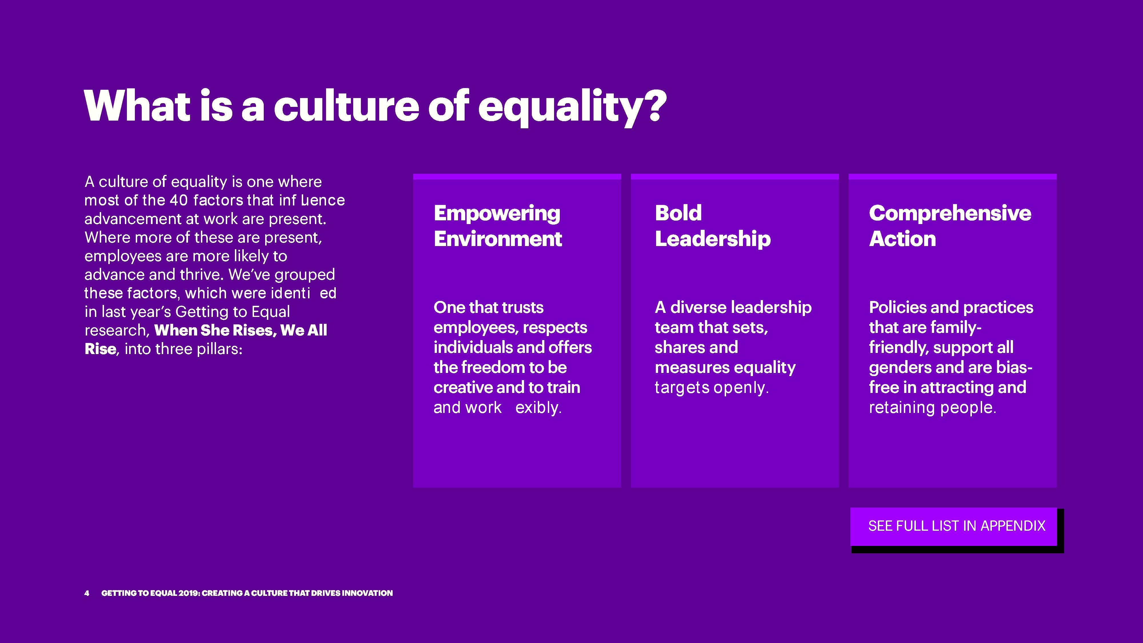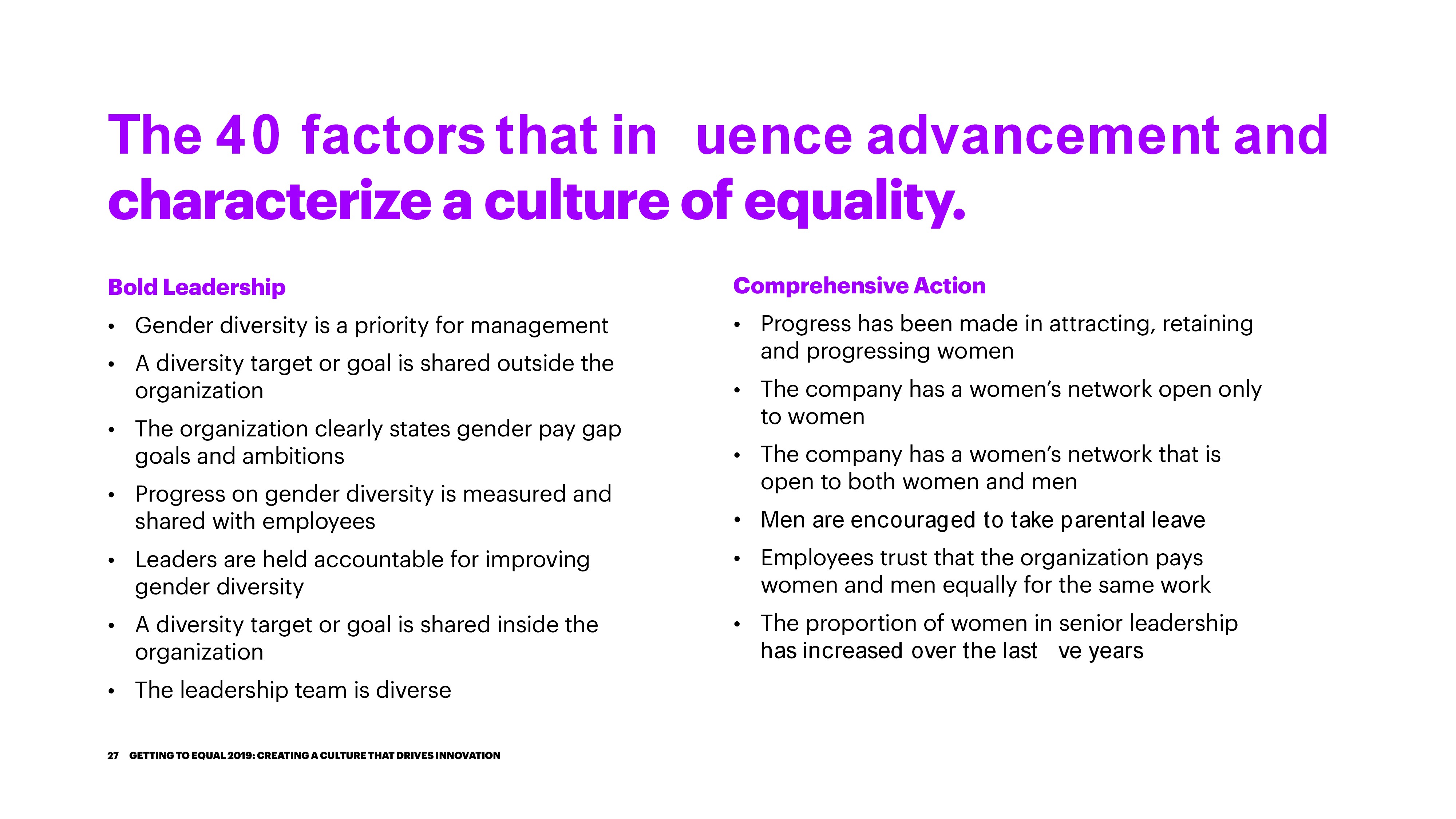 埃森哲的新研究确定了40个有助于形成平等文化的工作场所因素,并将它们分为三个可采取行动的类别:大胆的领导、全面的行动和赋权环境。