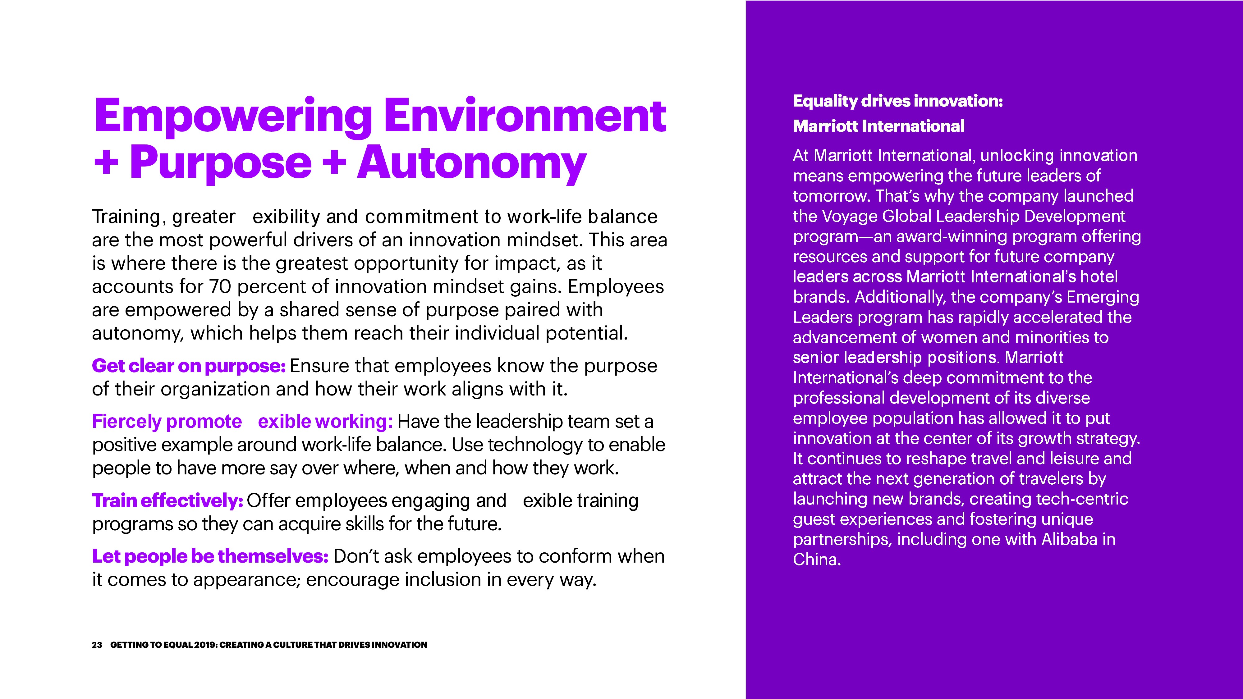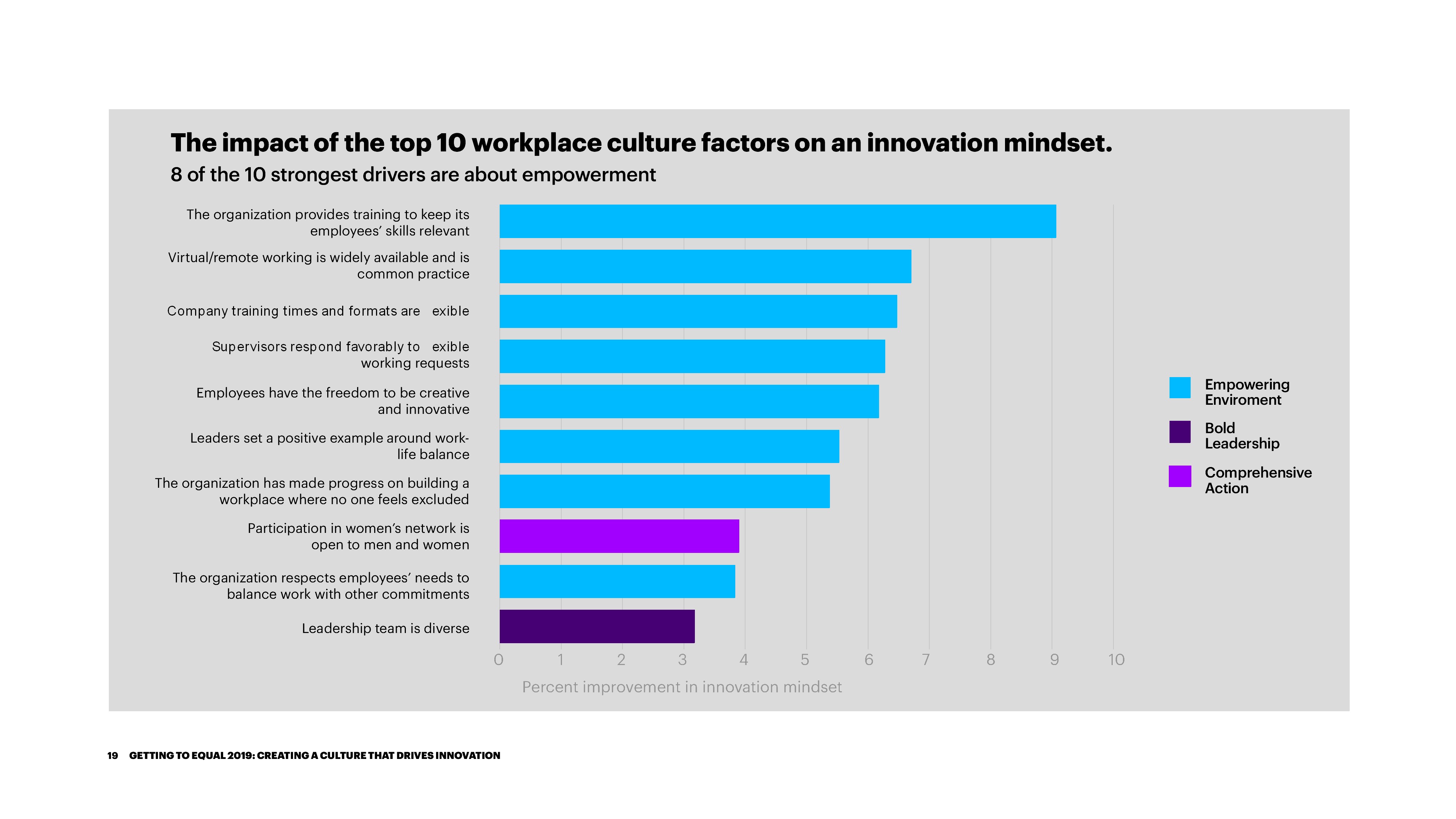 在增加创新思维方面,赋权环境是三个平等文化类别中最重要的,其中包括六个要素:目的、自主权、资源、灵感、协作和实验。工作环境越赋权,创新心态得分越高。