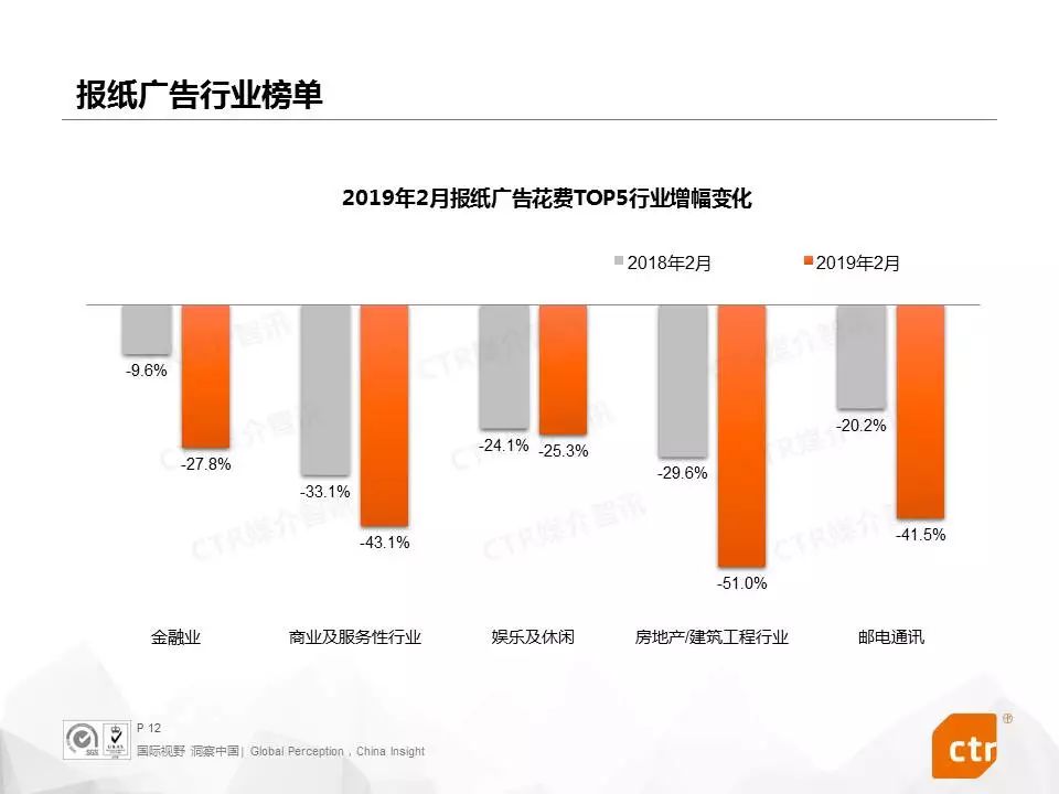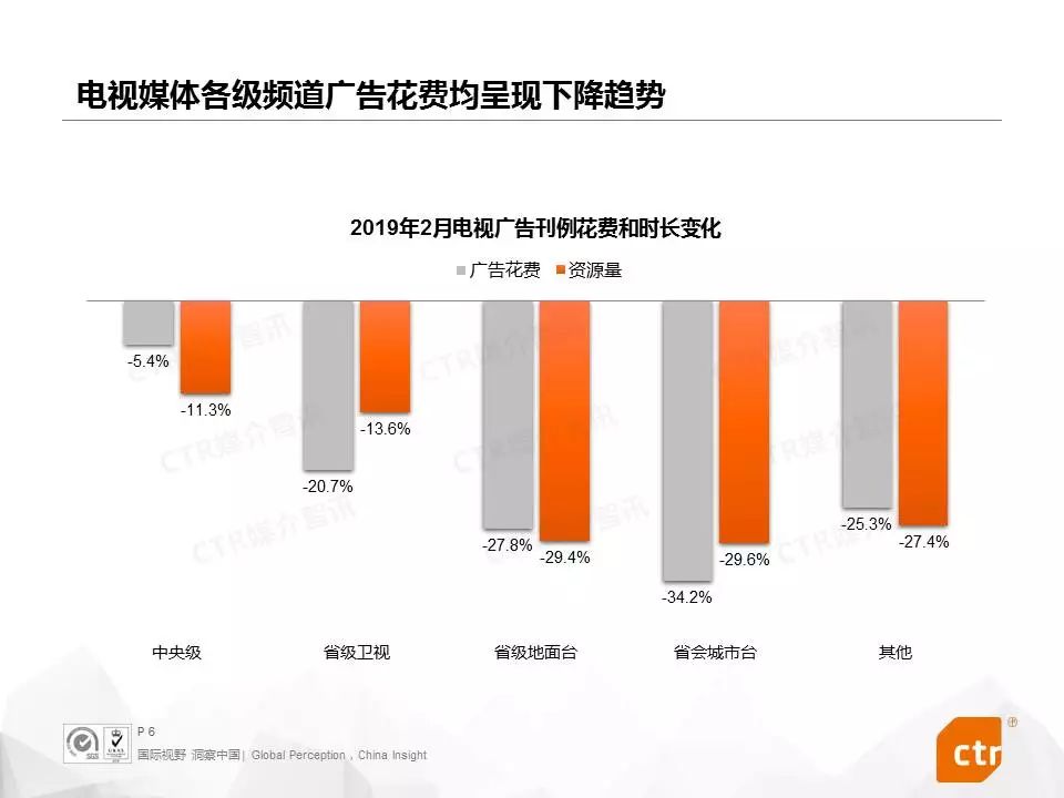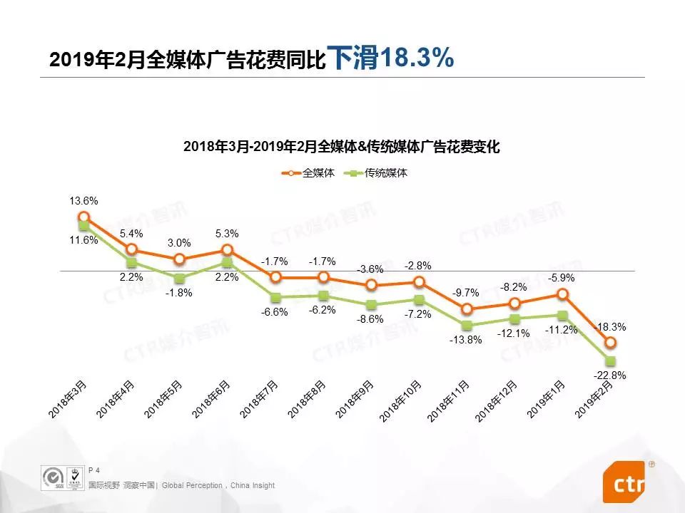 根据CTR媒介智讯的数据显示,2019年2月,中国广告市场同比下滑18.3%,传统媒体广告花费同比减少22.8%。传统媒体和全媒体的广告花费月度降幅进一步拉大,双双创近一年新低。
