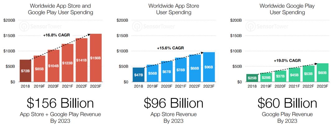 收入方面,到了2023年,全球App Store和Google Play的用户支出将达到1560亿美元,年复合增长率为16.8%。其中App Store收入将达到960亿美元,Google Play为600亿美元。