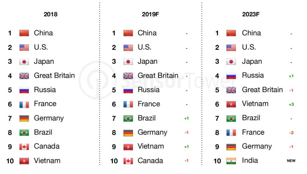 在2018年,以5.5亿次安装数排在第十的越南到了2023年将成为第六大应用下载市场,安装数将是2018的两倍。