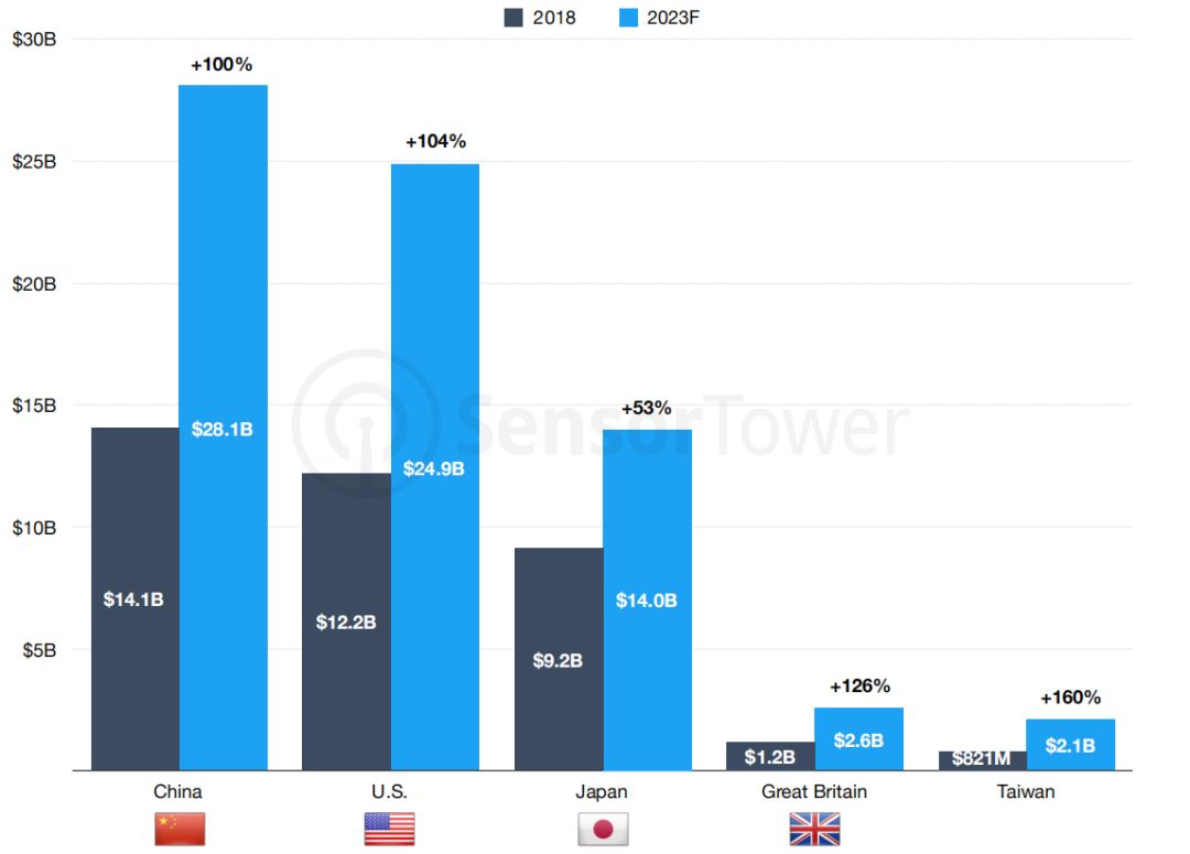 两个值得关注的增长市场:英国和中国台湾。台湾市场在接下来的5年中会迎来21%的年复合增长率,到了2023年他们的App Store收入会达到21亿美元,成为全球第五大地区市场。