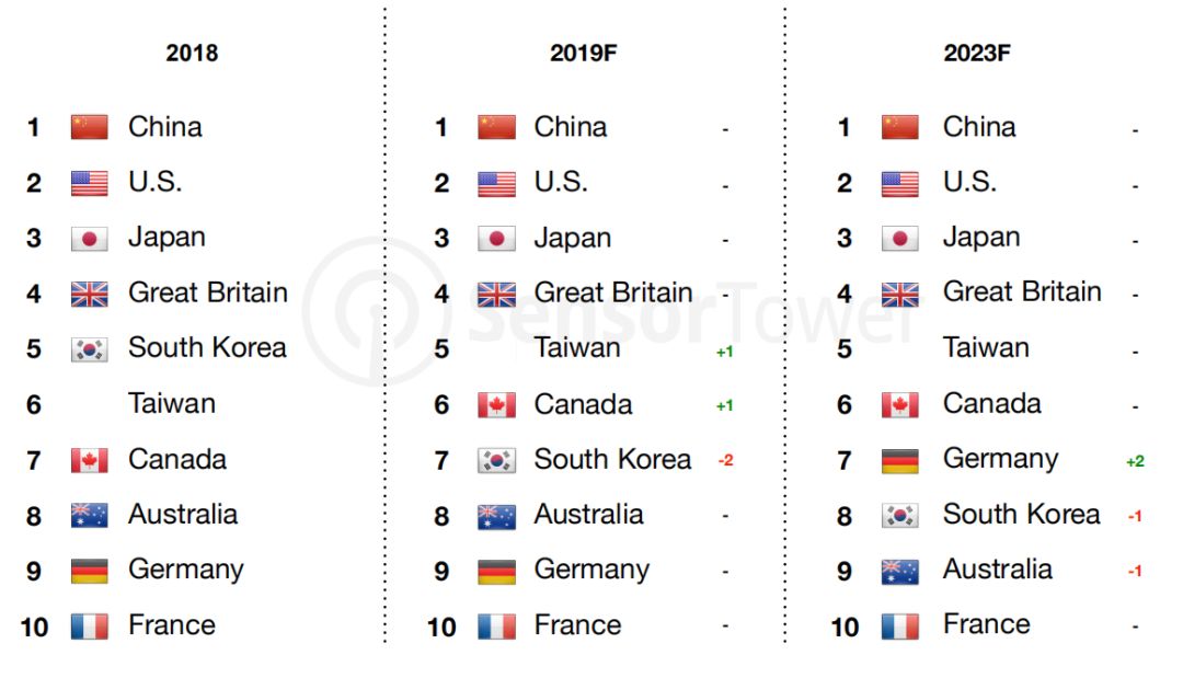 继在2018年出现营收下滑后,韩国市场预计在2019还会在榜上下滑两位,到了2023年将排在第八的位置上,也是TOP 10中App Store收入下滑最明显的国家。