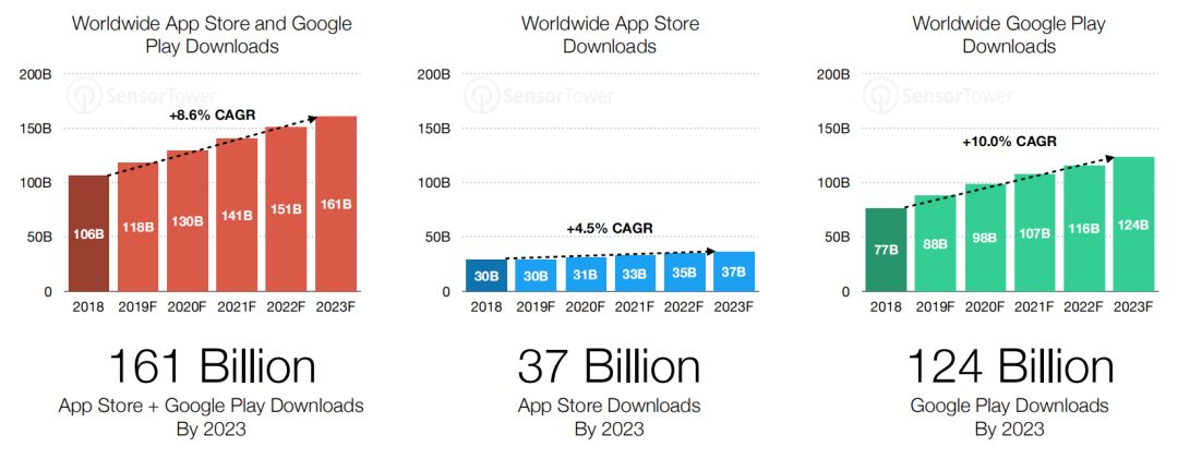 下载方面,在2023年,全球App Store和Google Play的产品下载数将达到1610亿次,年复合增长率为8.6%。其中App Store上产品下载数为370次,Google Play则达到1240次。