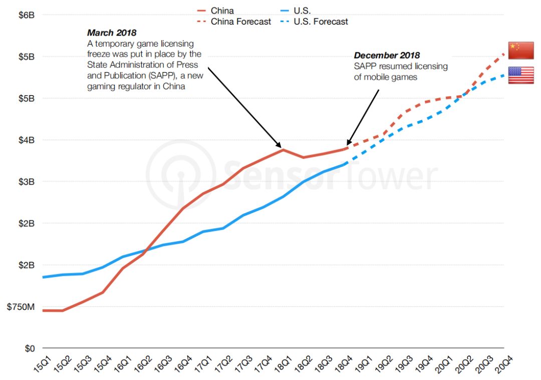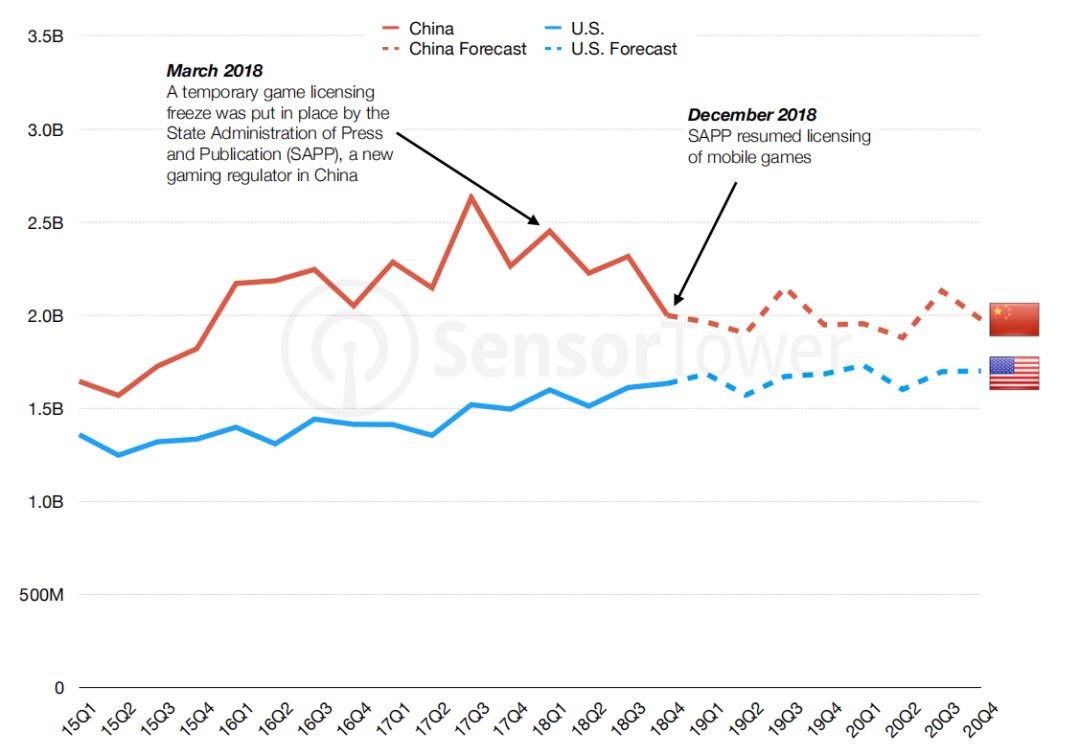 2018年由于版号原因,中国市场的App Store收入增长速度有所放缓,Sensor Tower预测2019依旧会保持低速增长,直到市场反弹。这也使得美国市场在逐渐缩小与中国市场的差距。