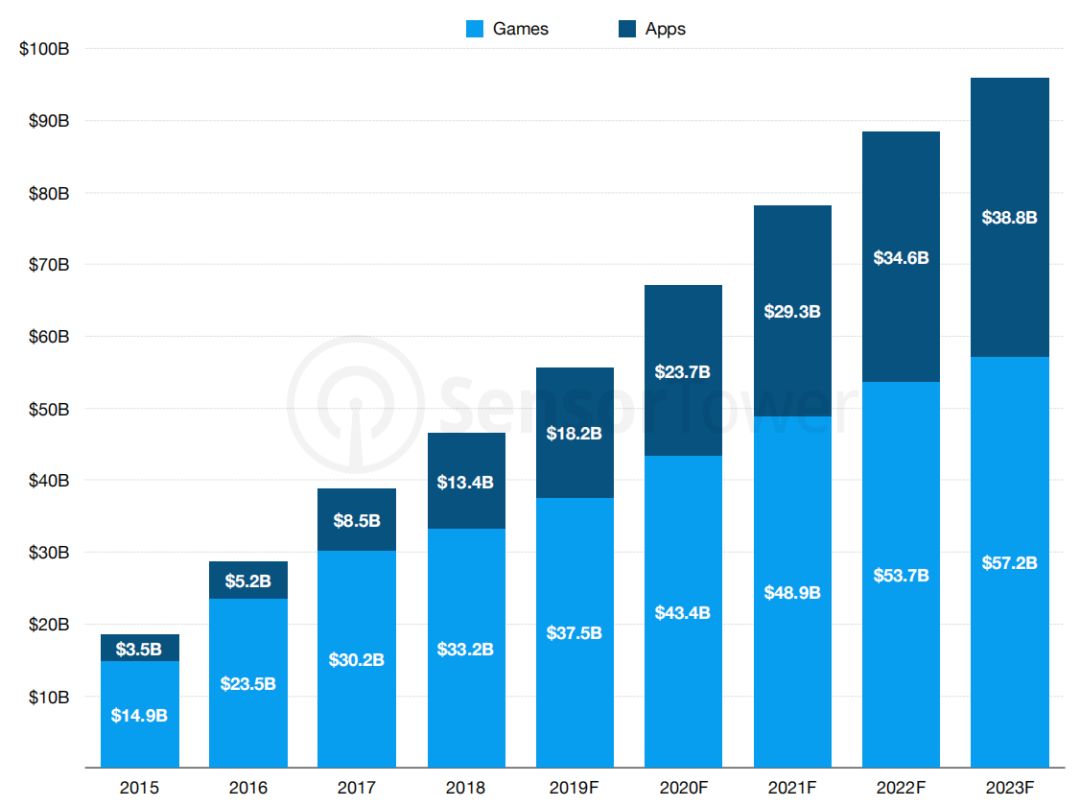 近日,Senser Tower发布了2019-2023年的移动市场预测报告,其中提到了两大应用商店的表现、各国家地区在未来5年的收入变化、应用和游戏在App Store中收入占比等方面。