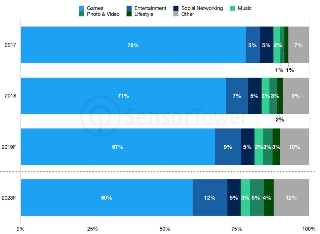 在2017年,游戏占App Store的收入达78%,而这个数字到了2023年将下降为60%。游戏收入的年复合增长率为12%,相比,应用的年复合增长率达到了24%。