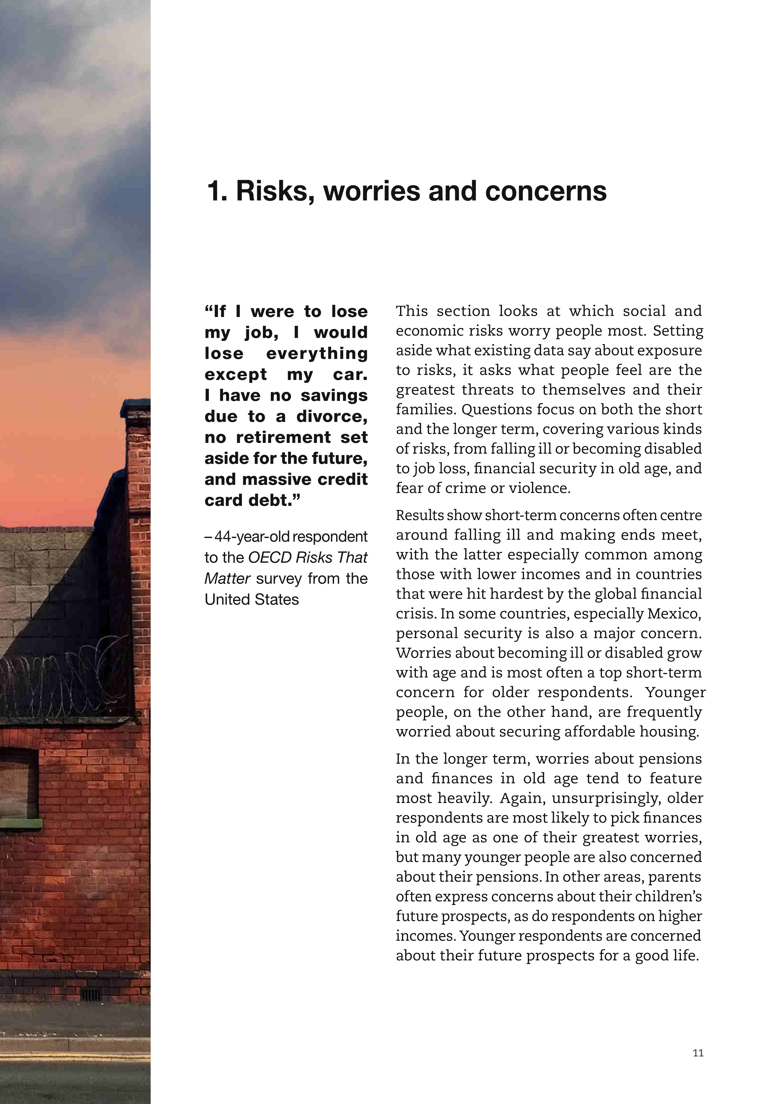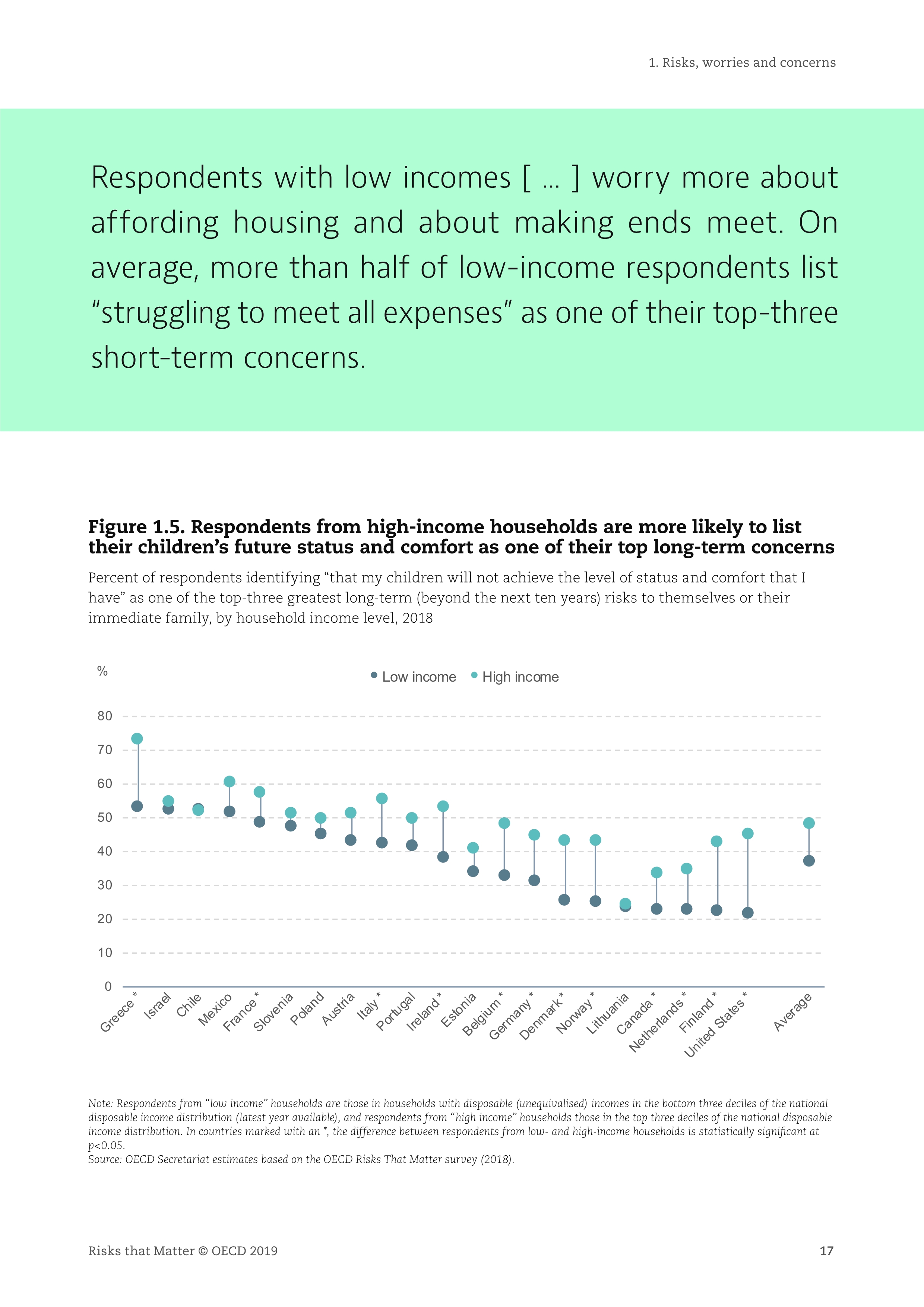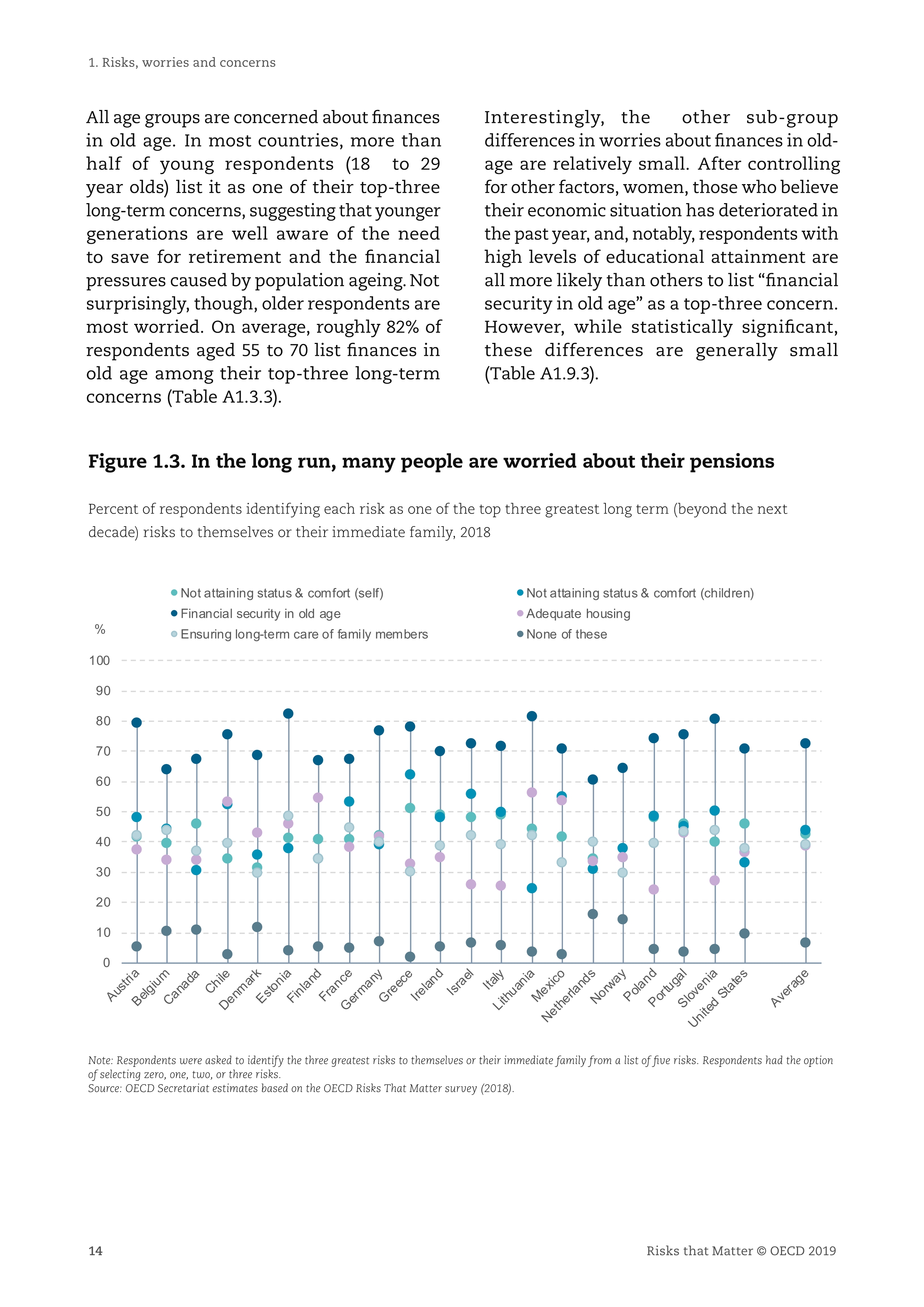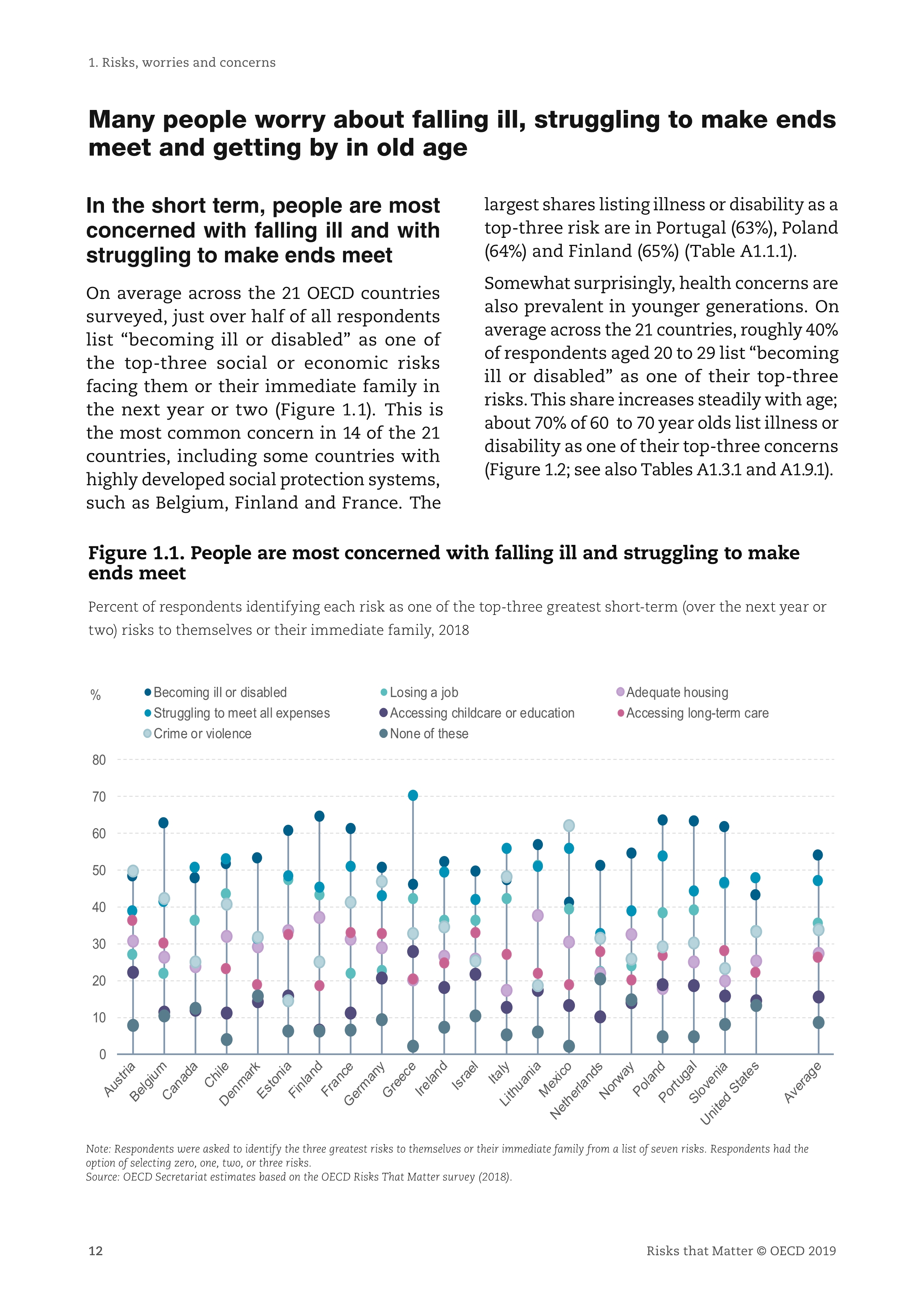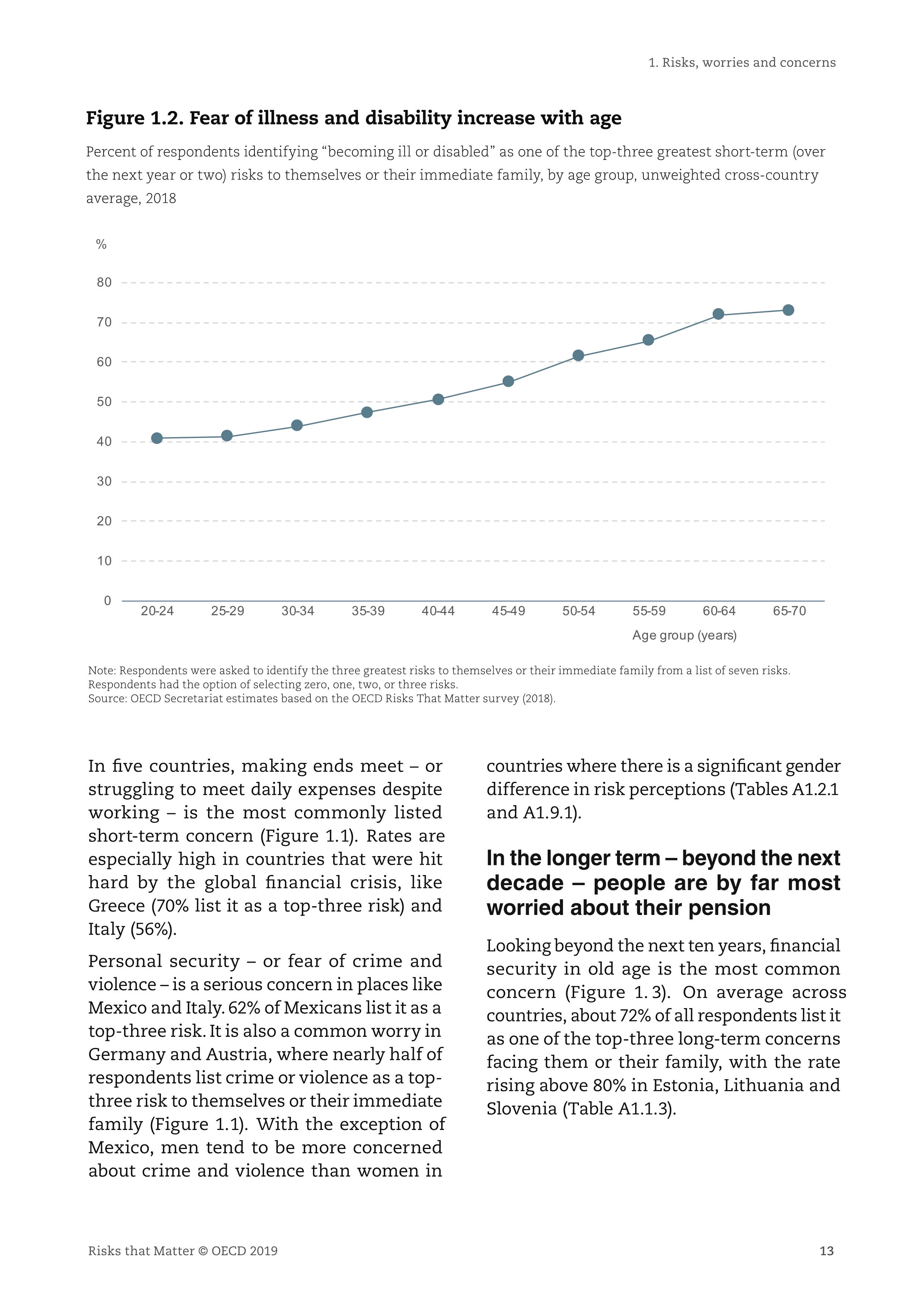 2018年风险调查显示,在短期内(未来一两年),疾病和无法维持生计是最重要的问题,人们对疾病和残疾的担忧随着年龄的增长而增加,尤其是那些低收入的人和遭受金融危机重创的国家的公民。
