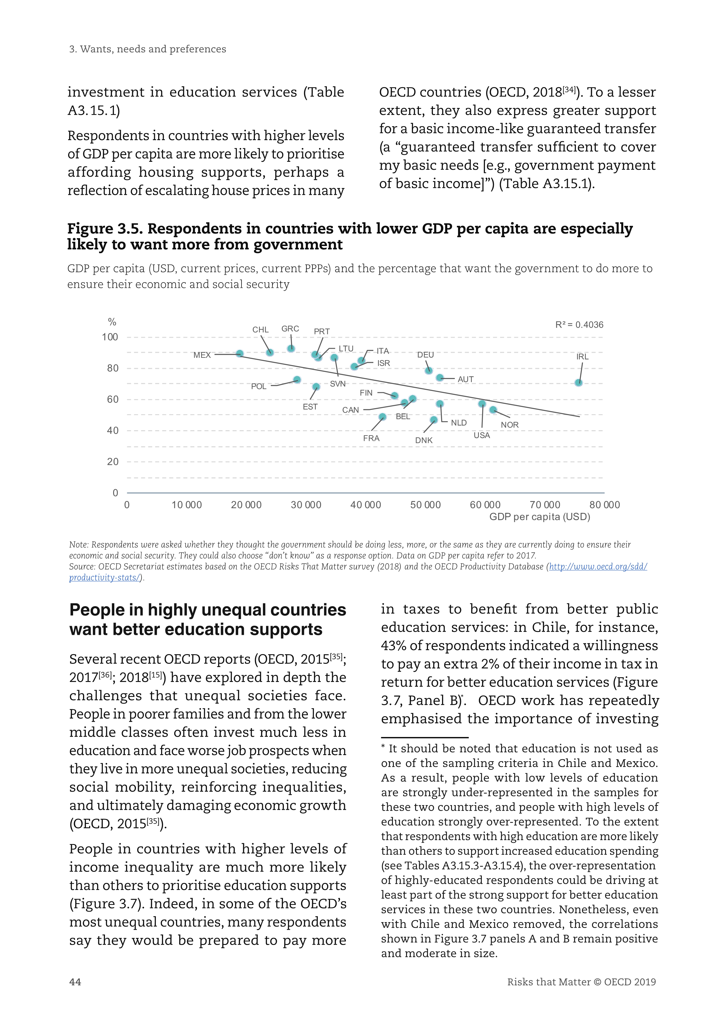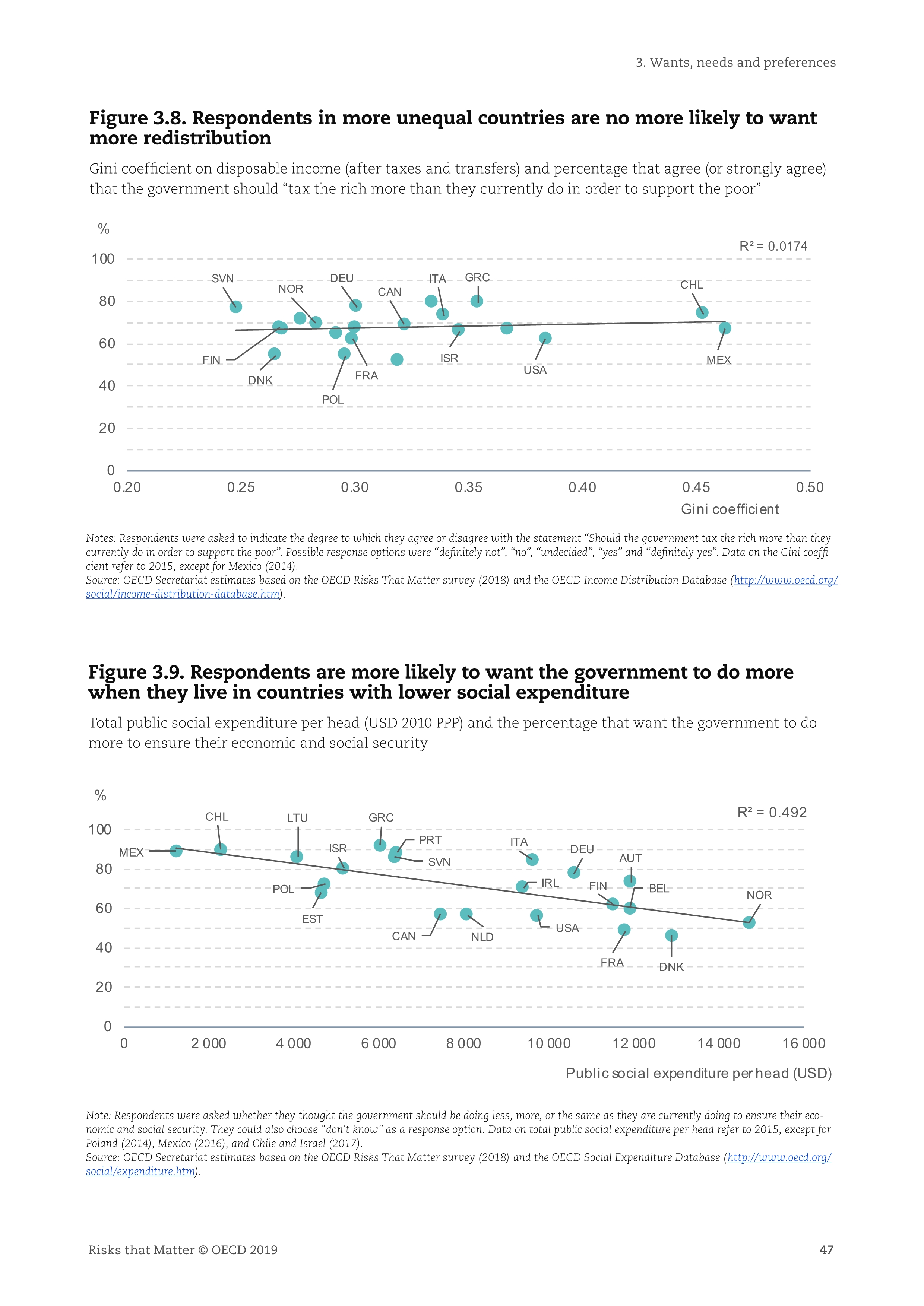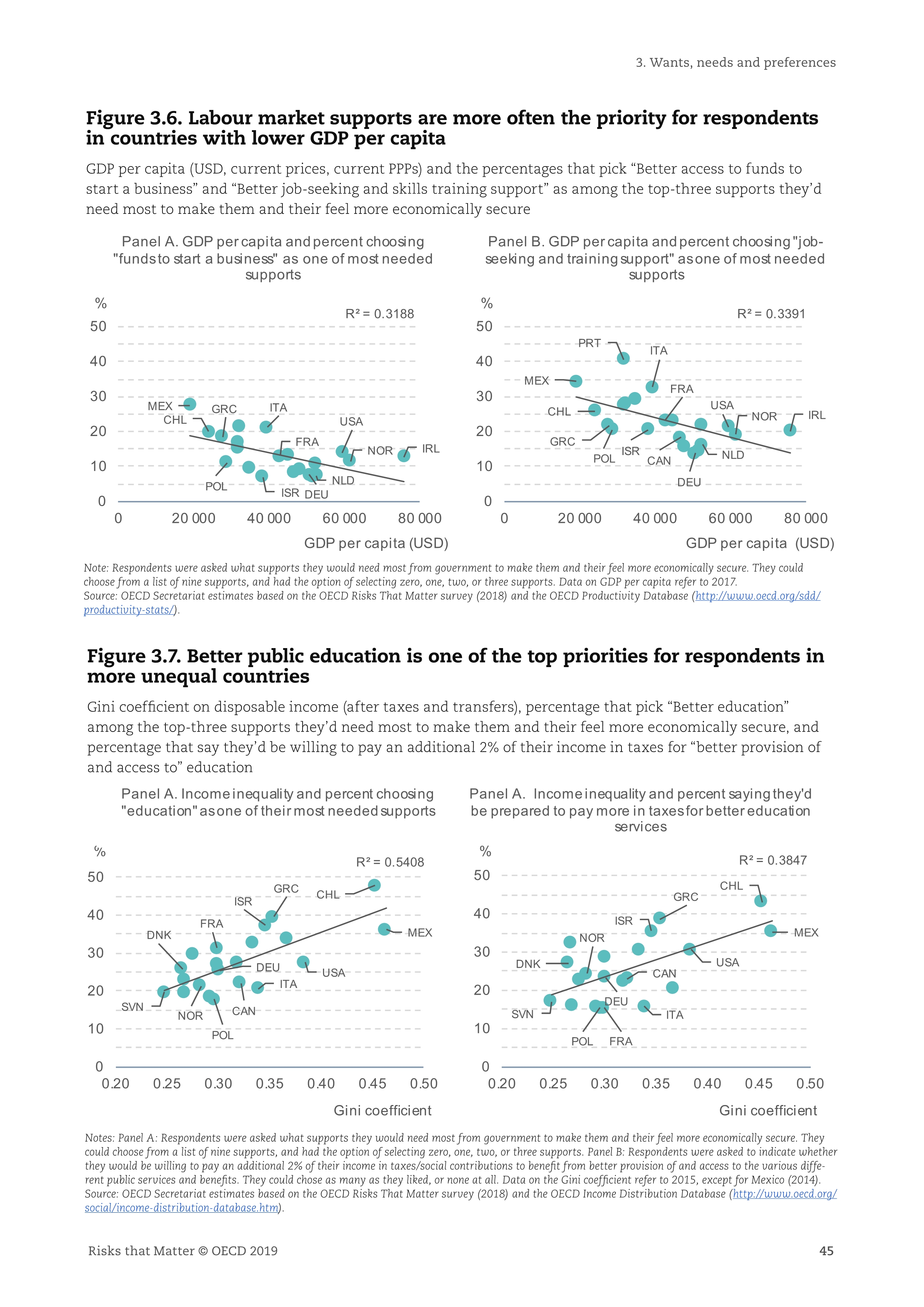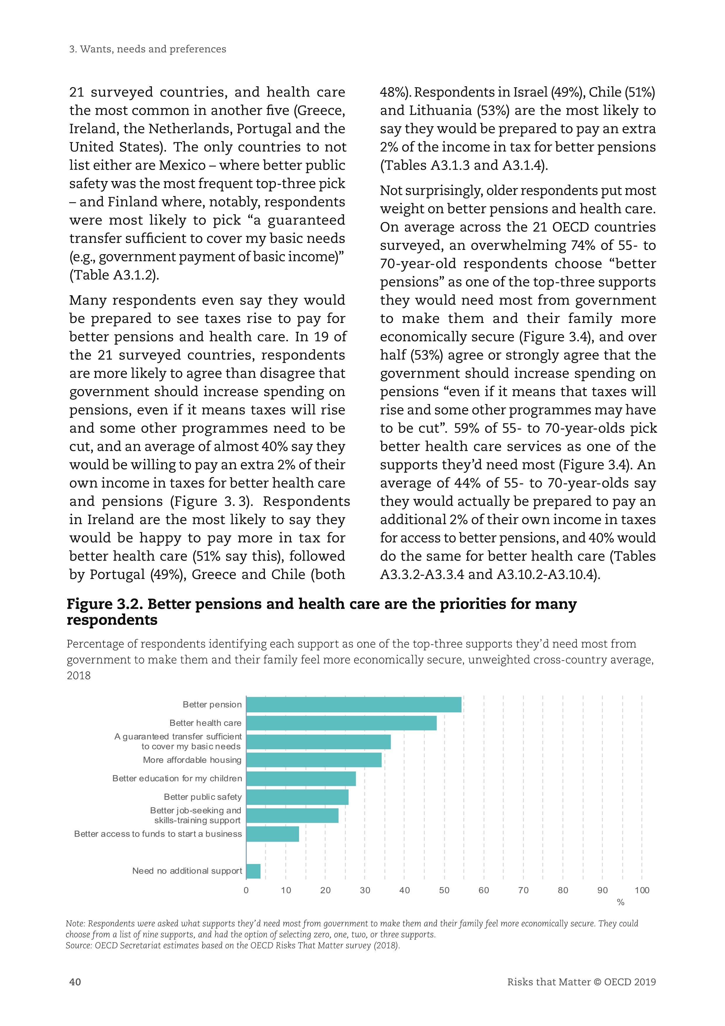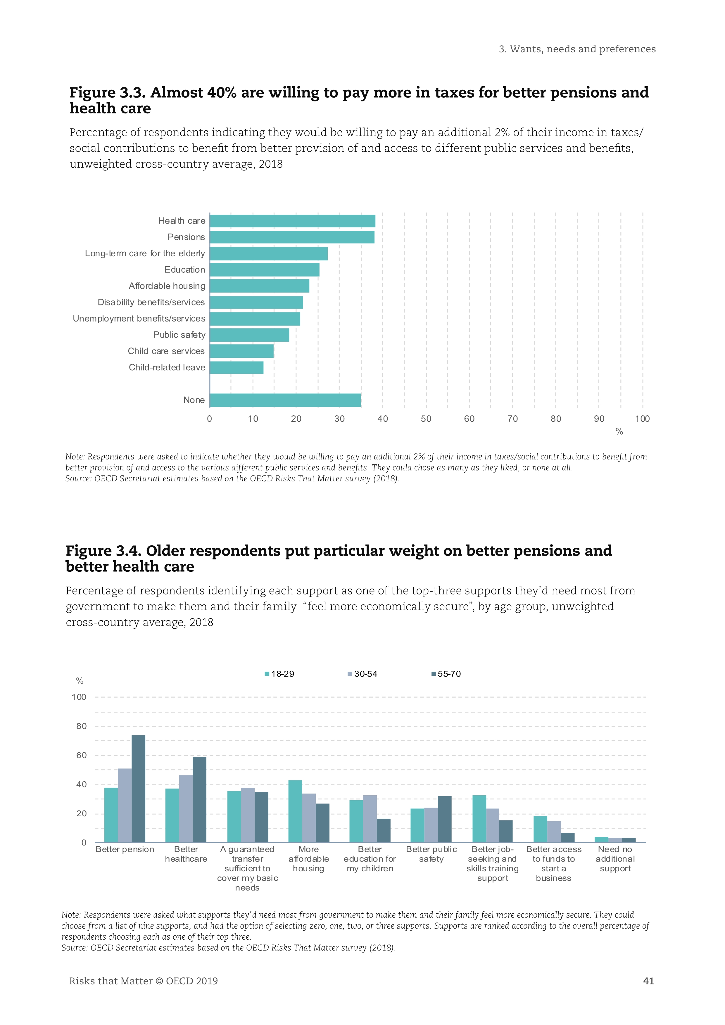 大多数人希望得到更多的支持,更好的公共卫生保健和养老金是最优先考虑的事项。平均而言,近40%的受访者愿意支付更多的税款,以获得更好的公共卫生服务和更好的养老金,在一些国家这一比例上升到约一半。