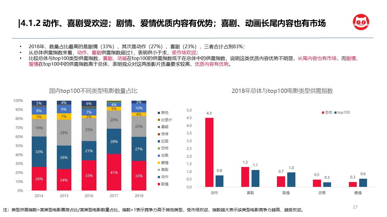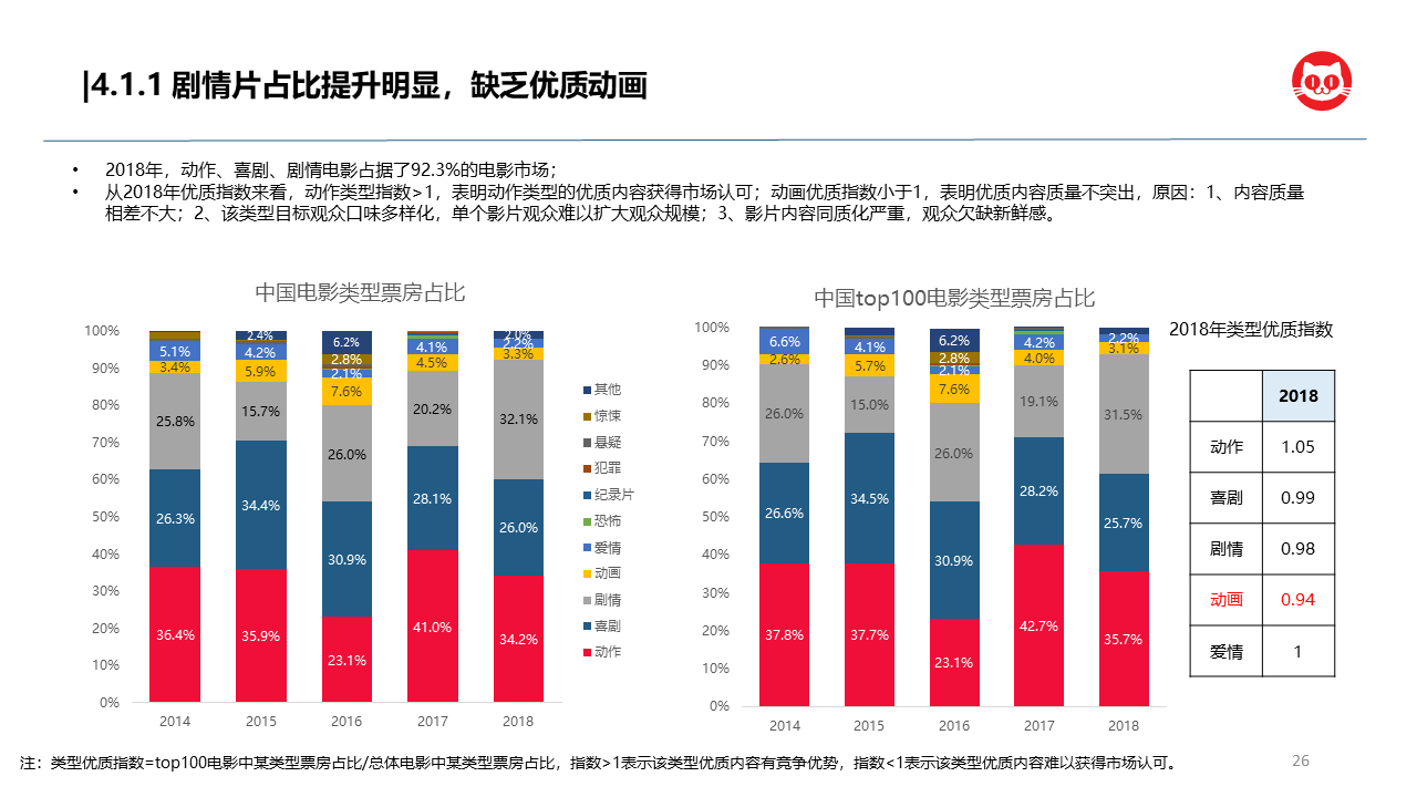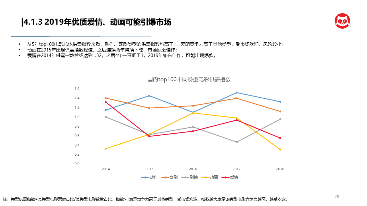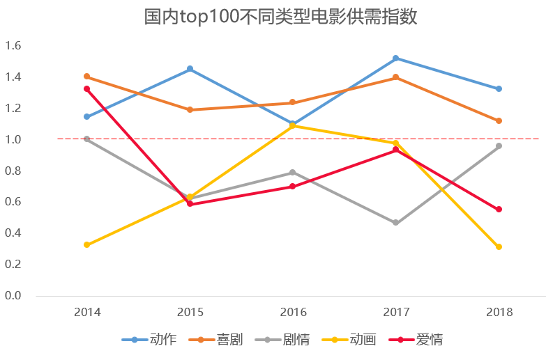 动画在2015年出现供需指数峰值,之后连续两年持续下降,市场缺乏佳作;爱情在2014年供需指数曾经高达1.32,之后4年一直低于1,市场亟需优质爱情电影,预计2019年动画电影、爱情电影如果质量较好,可能成为票房黑马。