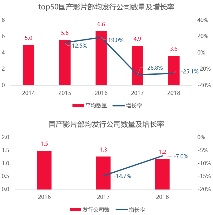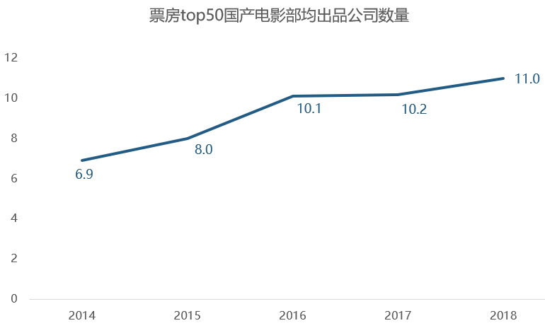 从最近几年中国top50国产电影来看,无论出品还是发行市场的竞争都更加激烈。不同的是,出品市场的竞争激烈体现在部均出品公司数量的增加,而发行市场的竞争激烈体现在部均发行公司数量的减少。