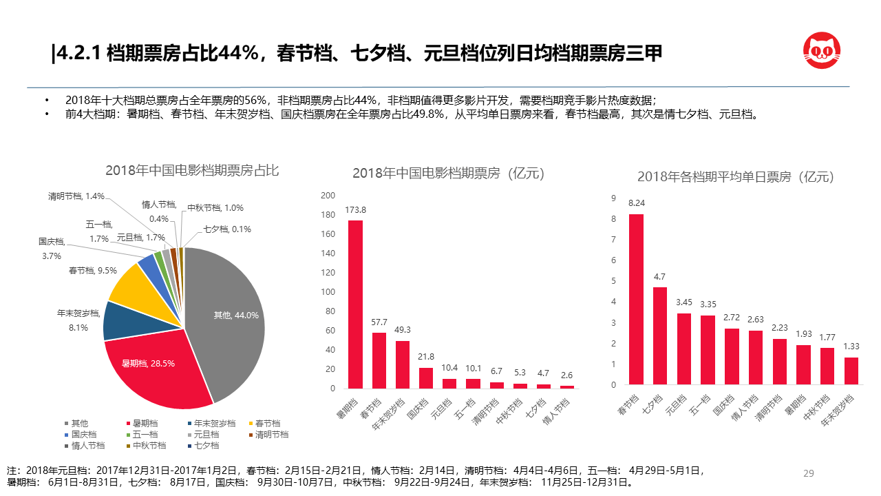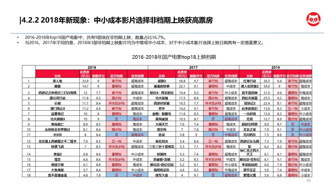 2016-2018年top18国产电影中,共有9部选在非档期上映,数量占比16.7%。不同于2016、2017年只有中高成本以上电影在非档期上映,2018年top18中,有3部中等成本或中小成本影片——《超时空同居》、《无名之辈》、《无问西东》,均选择在非档期上映。这表明在大片扎堆档期,档期竞争异常激烈的情况下,中小成本影片在上映日期选择方面更加理性,尤其对于质量较好的中低成本影片具有一定借鉴意义。