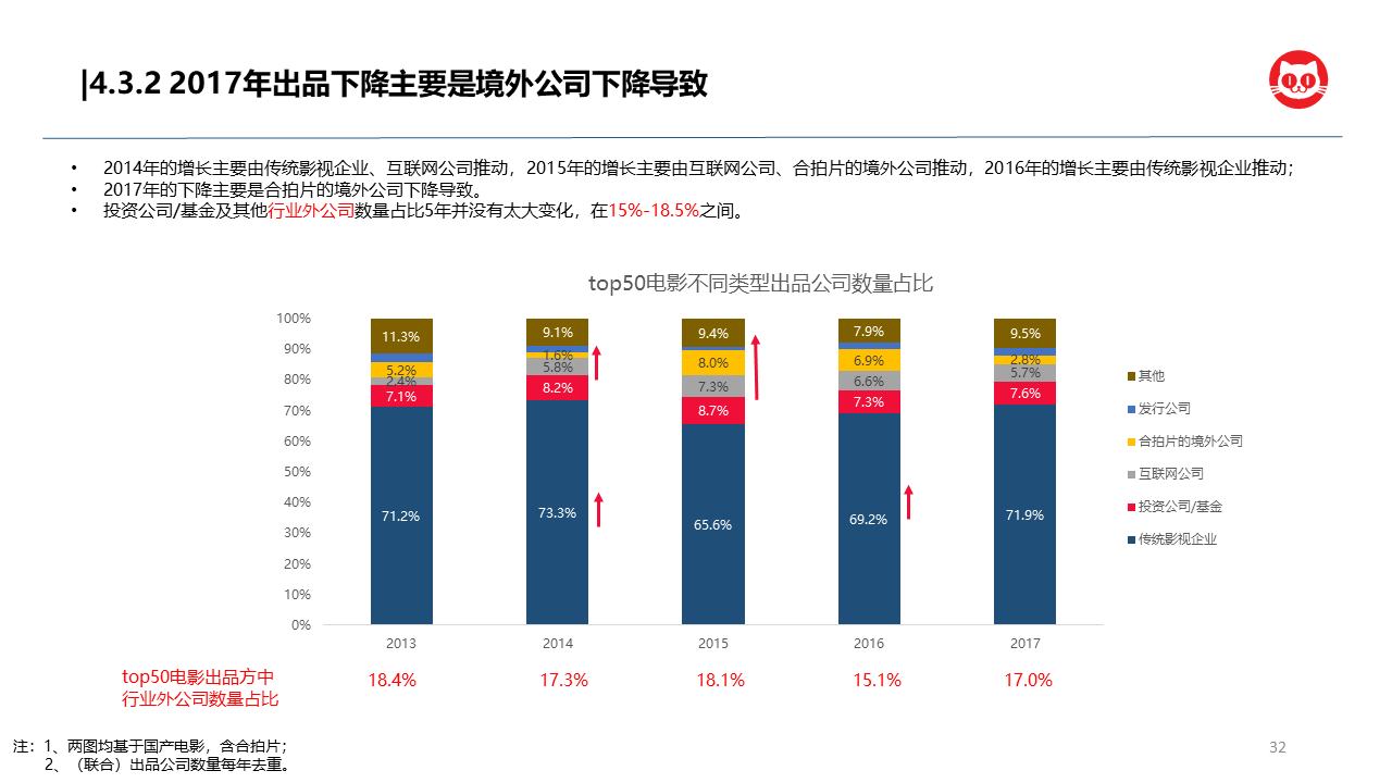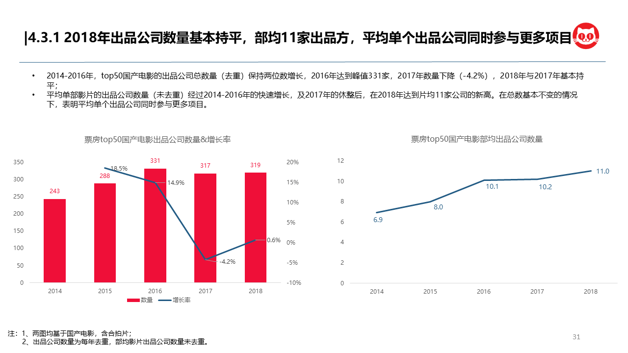 2018年对比2017年,top50国产影片的出品公司总数量基本持平,平均单部影片的出品公司数量(未去重)经过2014-2016年的快速增长,及2017年的休整后,在2018年达到部均11家公司的新高。在总数基本不变的情况下,表明平均单个出品公司同时参与更多项目,各大出品公司对于优质内容的抢夺更加白热化。