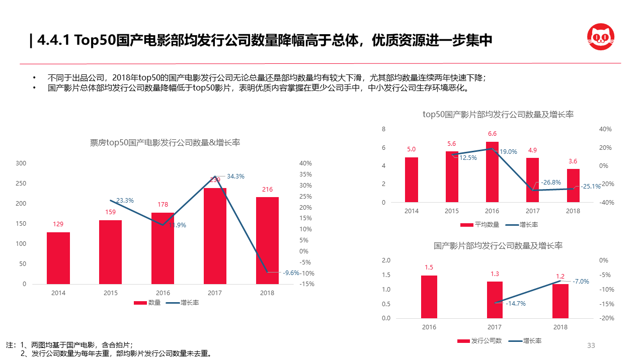 与出品公司总量趋势不同的是,2018年top50的国产电影发行公司总量有较大下滑,2014-2016年,top50国产电影的发行公司总数量一度保持两位数增长,2016年达到峰值331家,2017年数量下降(-4.2%),2018年与2017年基本持平。