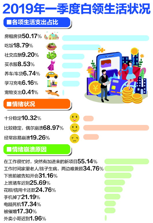 当白领为了理想的生活而拼命努力时,工作回馈给白领的收获如何呢?在这个跳槽旺季,智联招聘从白领生活的生活、健康、社交、职场等四个方面出发,对11024名职场人士进行了问卷调查,并发布了《2019年一季度白领生活状况调研报告》,报告显示,6成白领午餐在20元以内,8成关注饮食安全;4成白领是单身,近一半单身白领希望扩大社交圈;白领因缺钱失去安全感,干不完的工作压垮个人情绪;超6成白领认为当前工作不值得。