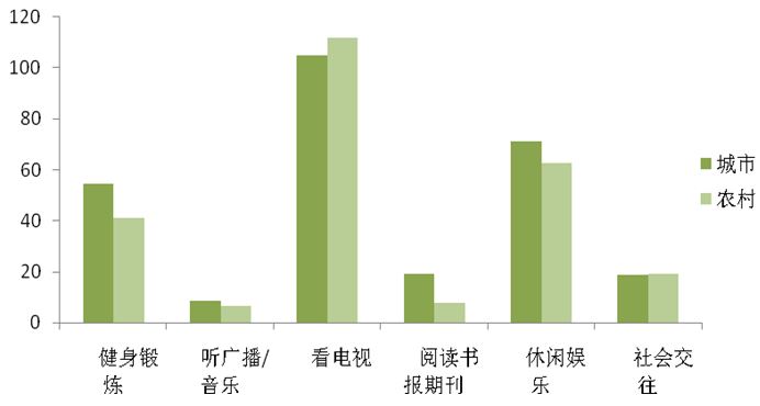 农村居民每天花费在看电视的时间比较多,为1小时52分钟,城镇为1小时45分钟,农村较城镇多7分钟。城市居民在健身锻炼、听广播/音乐、阅读书报期刊(含电子介质)和休闲娱乐的时间多于农村,分别高于农村13分钟、2分钟、11分钟和9分钟,城镇居民的个人自由支配时间更丰富多彩。