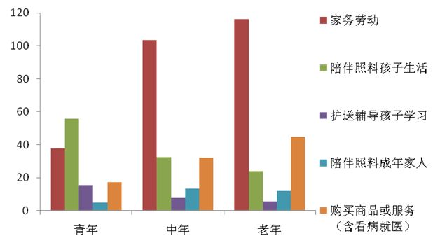 2.老年人的家庭劳务时间最长,青年人更关爱子女成长