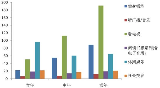在个人自由支配时间中,老年人的个人自由支配时间最多,平均时间达到了6小时45分钟,中年人为4小时32分钟,青年人为3小时41分钟。看电视、健身锻炼和休闲娱乐是个人自由支配时间的三大模块。在青年人中,休闲娱乐是主要的个人自由支配时间,平均时间为1小时36分钟,其次是看电视,平均时间为50分钟;在中年人中,看电视是主要的自由活动时间,为1小时52分钟,其次是休闲娱乐,平均时间为1小时,健身锻炼也达到了55分钟;在老年人中,看电视是最主要的自由活动时间,为3小时12分钟,其次是健身锻炼,为1小时29分钟。