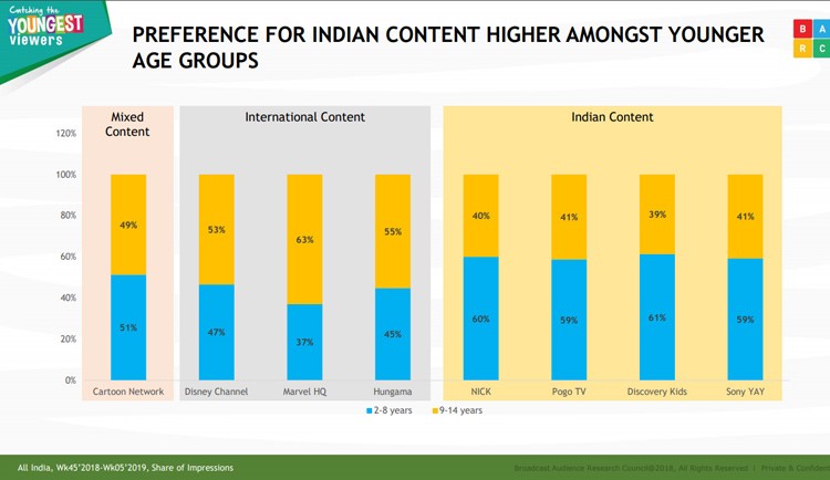 印度全国儿童频道本土化内容和时长增长了18%。随着年龄的增长,孩子对内容的喜好在改变,较小的儿童更喜欢本土内容。