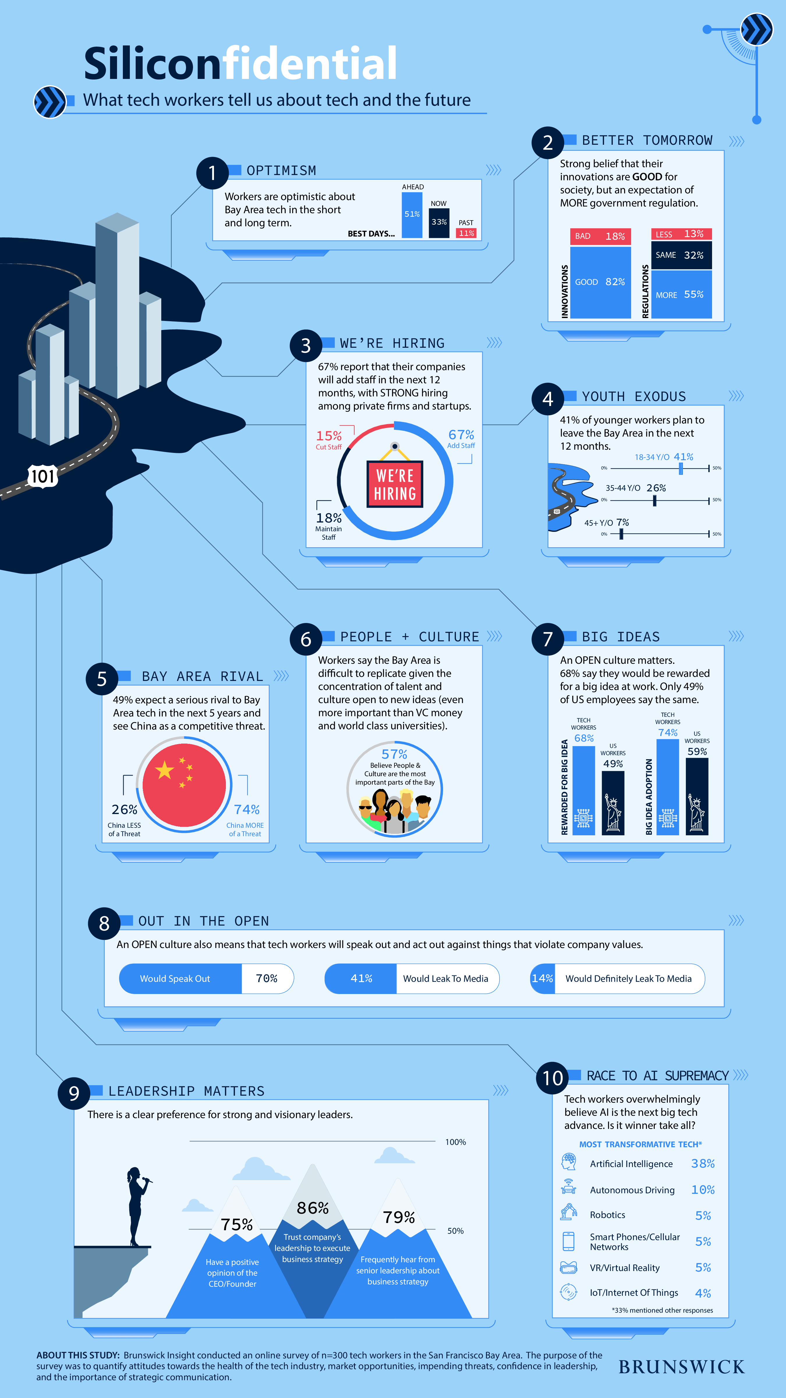这份由企业顾问公司博然思维(Brunswick Group)发布的调查报告显示,随着其他科技城市的兴起,越来越多的顶尖硅谷科技人才考虑或已经搬离。在18岁至34岁之间的年轻族群中,有41%的人计划明年离开湾区。而在接受调查的科技公司中,有一半表示,与一年前相比寻找和招聘到合适的科技人才越来越困难。