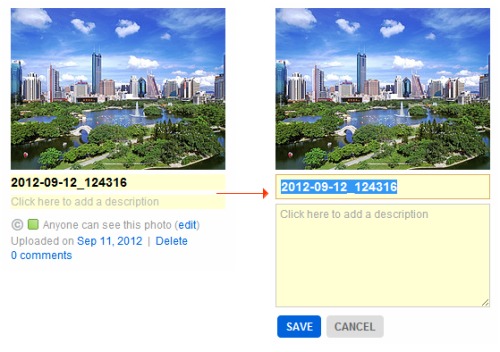 在Flick里进行图片编辑时,只需在文件名处点击下,即可在原来的位置进行重命名和添加图片描述;在行内进行编辑,所见即所得,缩短了用户操作和体验的距离。