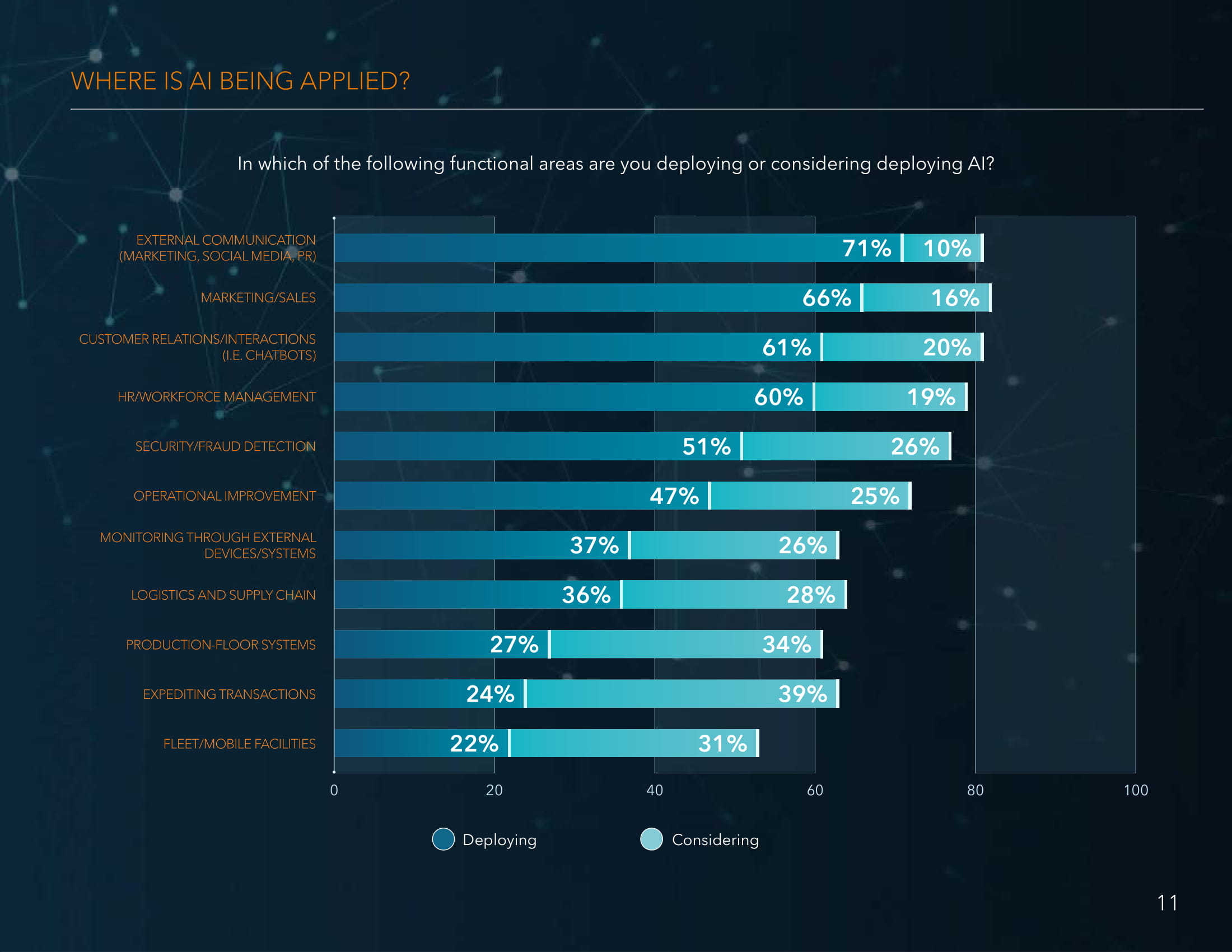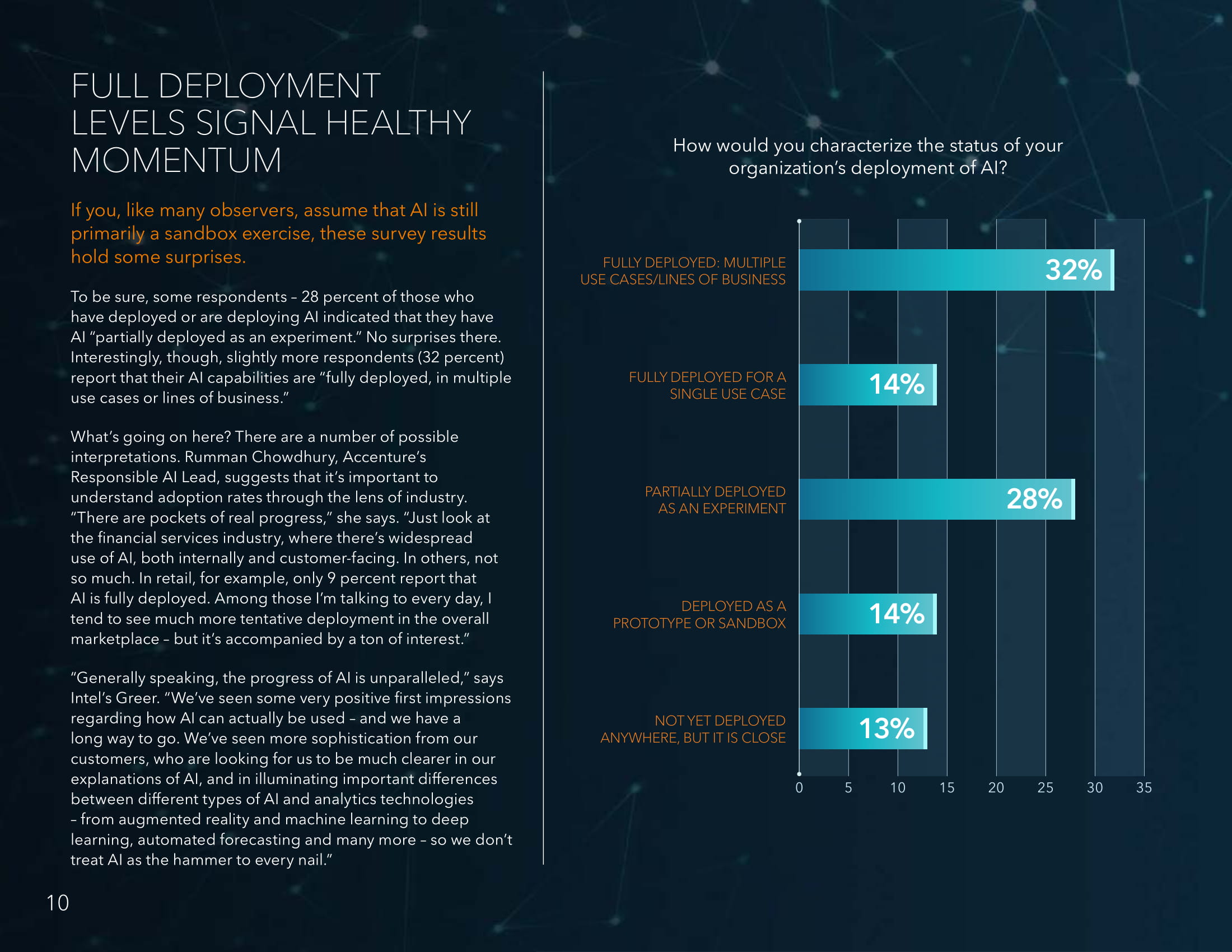 许多受访者已经超越了人工智能部署的试验阶段,进入了更广泛的应用领域。
