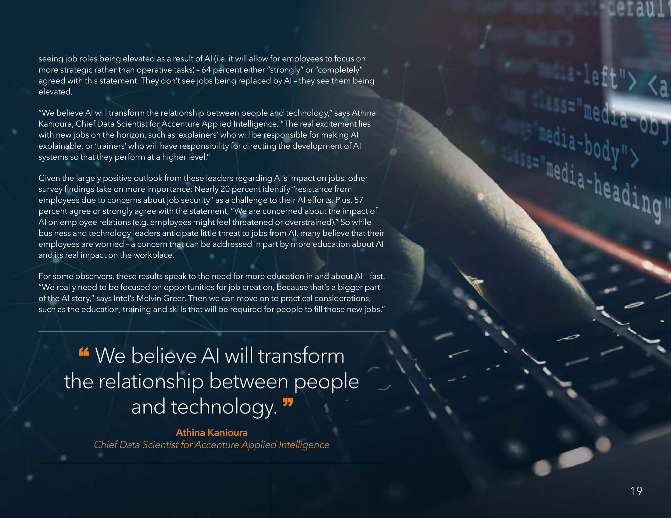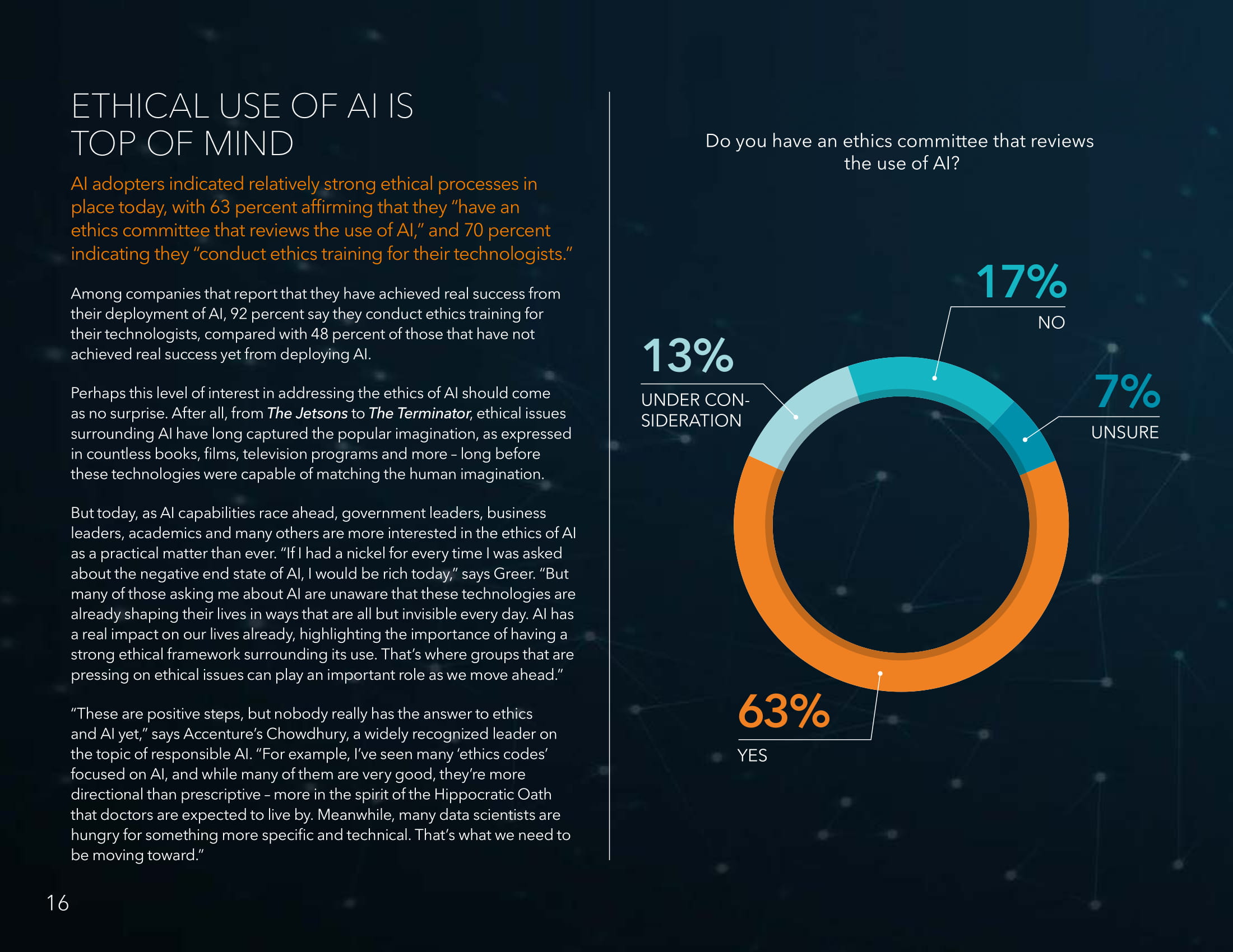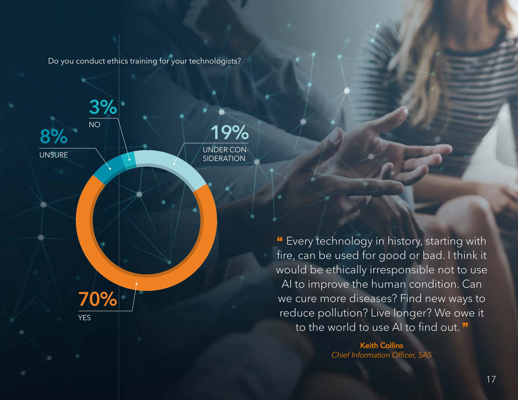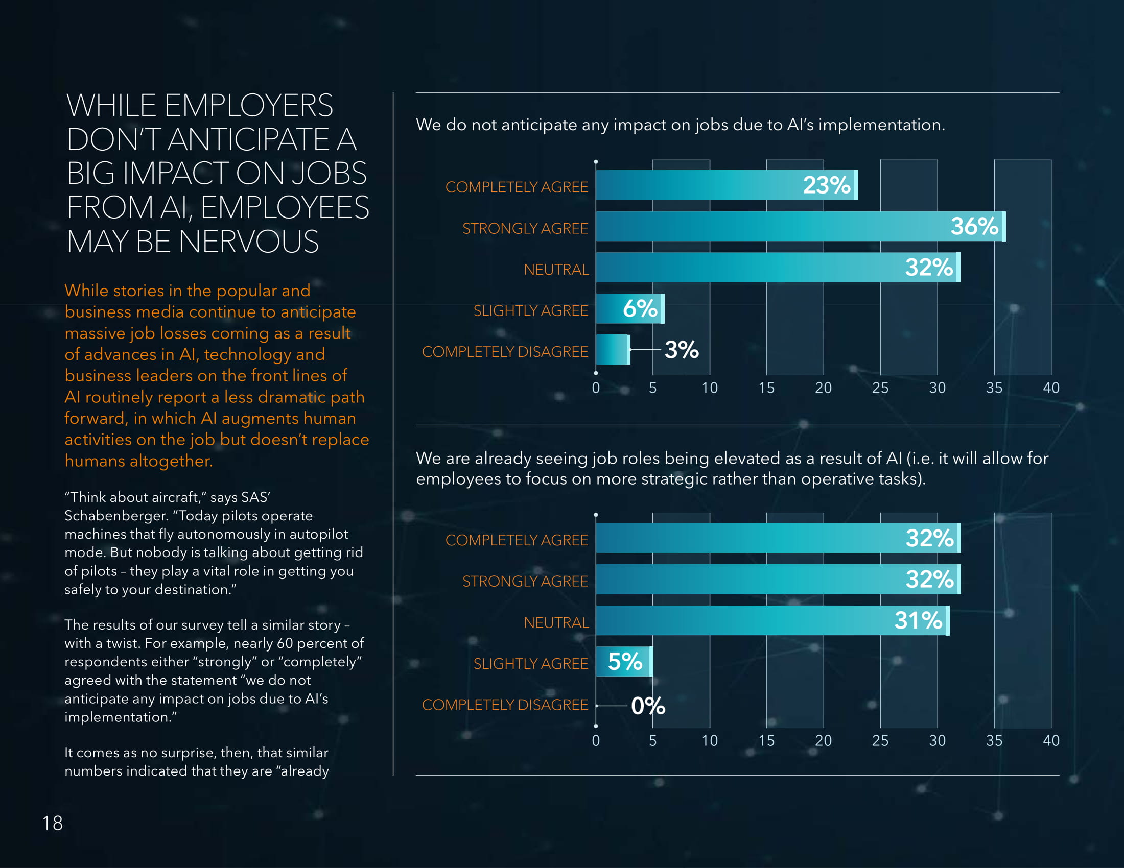 大多数受访者已经制定了注重道德操守的程序。虽然雇主预计人工智能不会对工作产生重大影响,但员工可能会感到紧张。有报告表明,人工智能造成的失业威胁可能被大大高估。受访者认为,大规模失业的可能性不大。然而,一些人担心员工对人工智能的影响的看法。